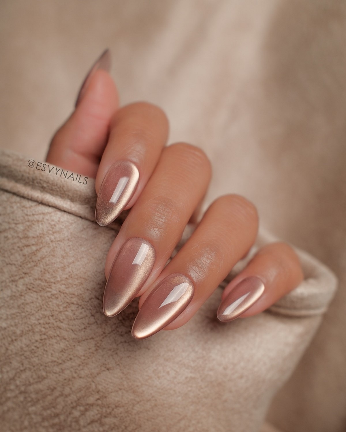 Магнітний лак з ефектом котячого ока на нюдовій основі створює зачаровуючий відблиск, що переміщається по поверхні нігтя. У холодну пору року особливо актуальні теплі відтінки Cat Eye — золотисті, мідні, бронзові, які додають дизайну розкоші. Відблиск може бути розташований класично по центру, діагонально або у вигляді хвилі, кожен варіант створює унікальний візуальний ефект.