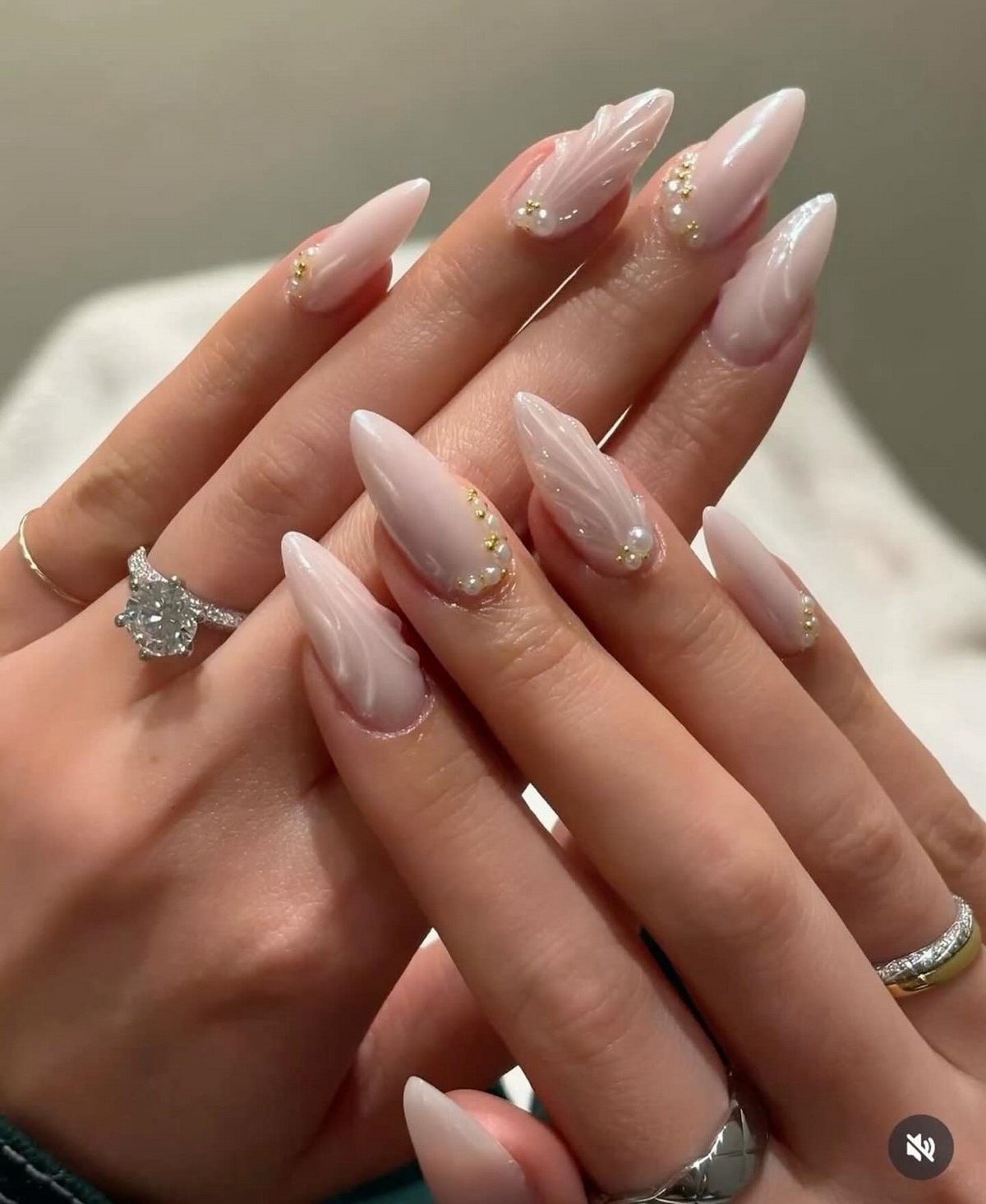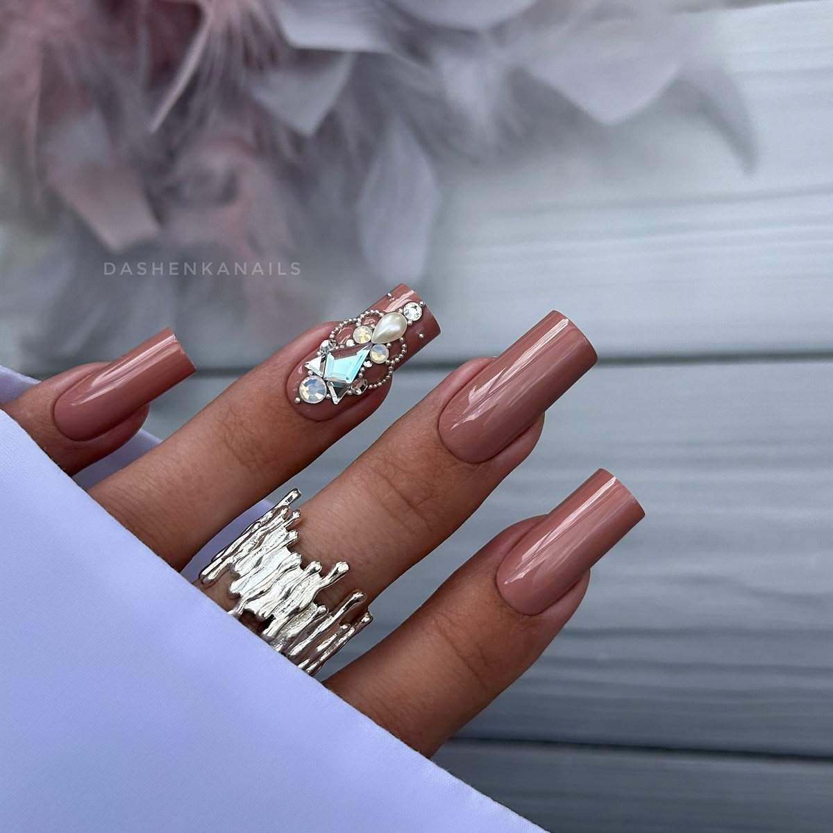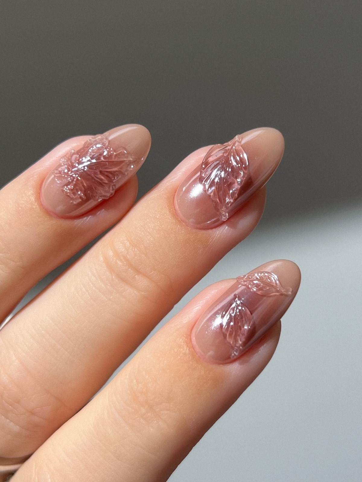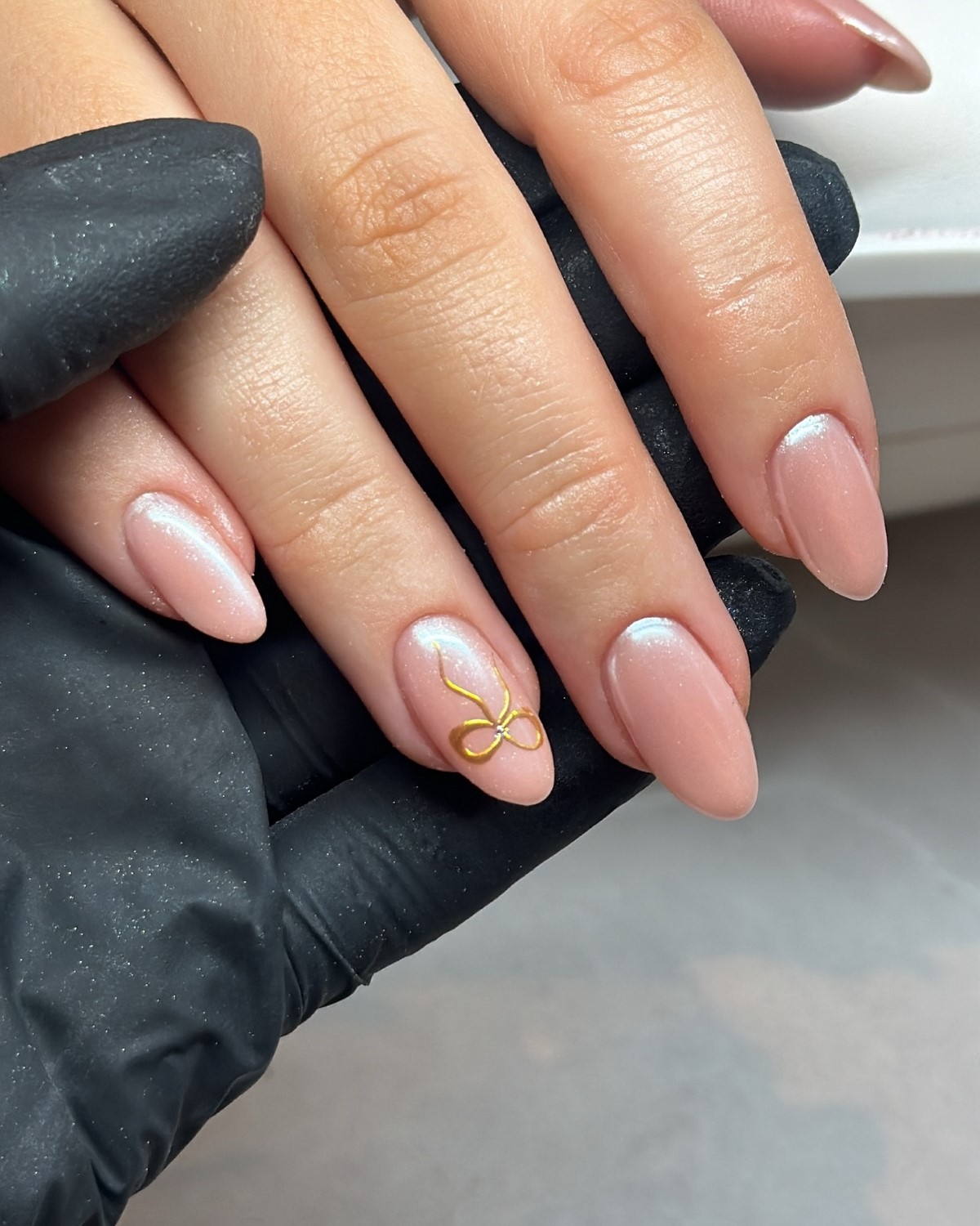 Об’ємний декор на нюдовій основі — це вершина нейл-арту для особливих випадків. Ліпні елементи, виконані акриловою пудрою або гелем, створюють рельєфні візерунки, що імітують мереживо, квіткові пелюстки або геометричні фігури. У сезоні 2025-2026 популярні мінімалістичні 3D-акценти на одному-двох нігтях — перлинні намистини, мікрокульки або тонкі об’ємні лінії, які не перевантажують дизайн, але додають вишуканості.
