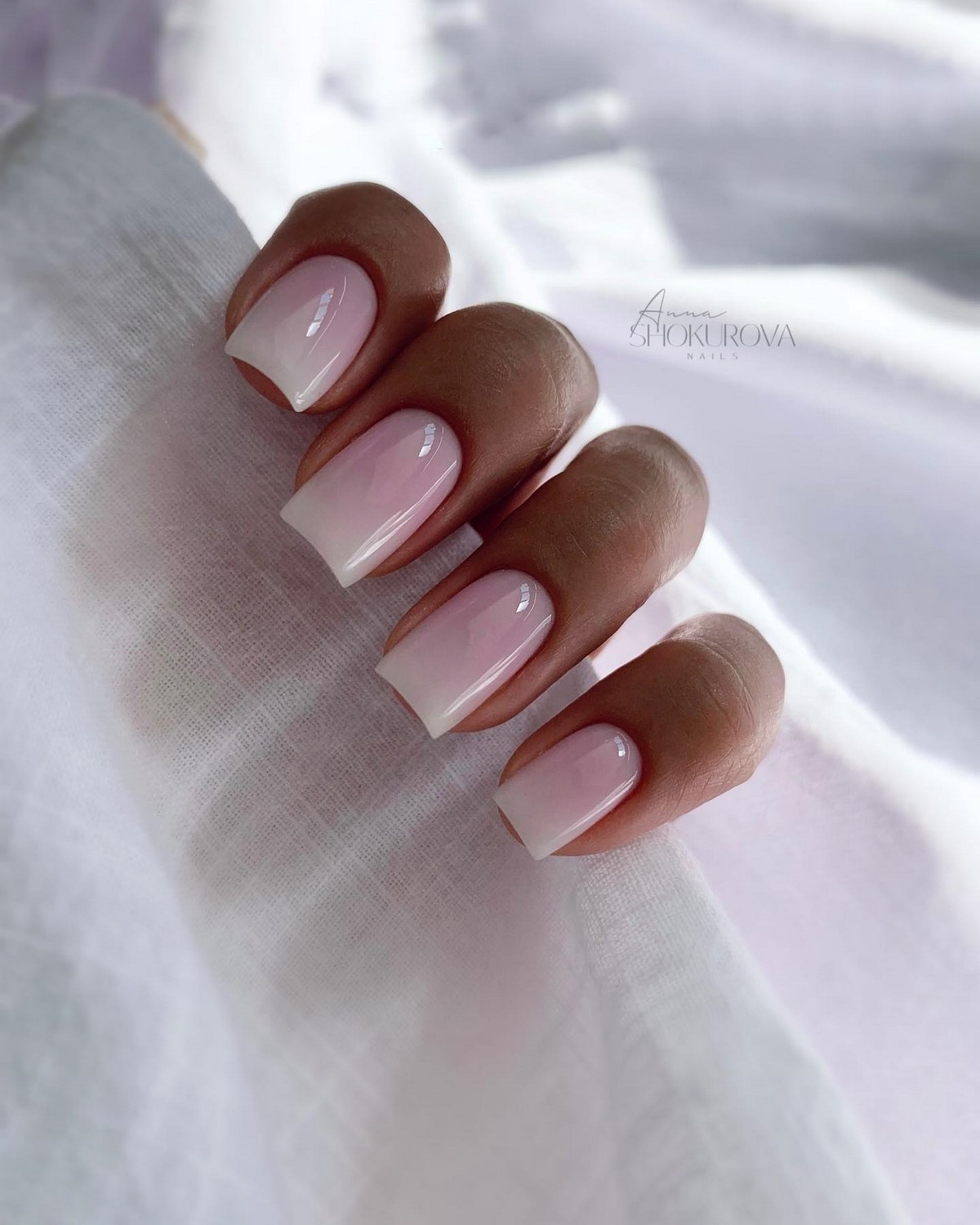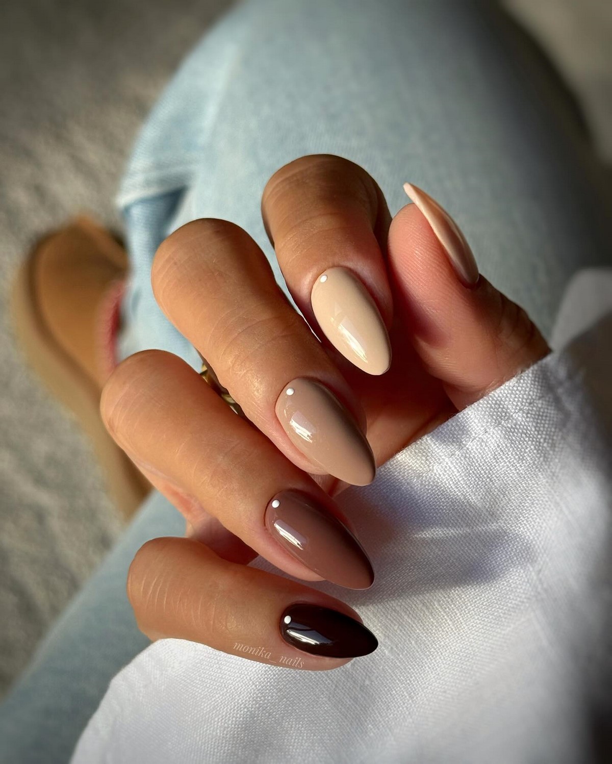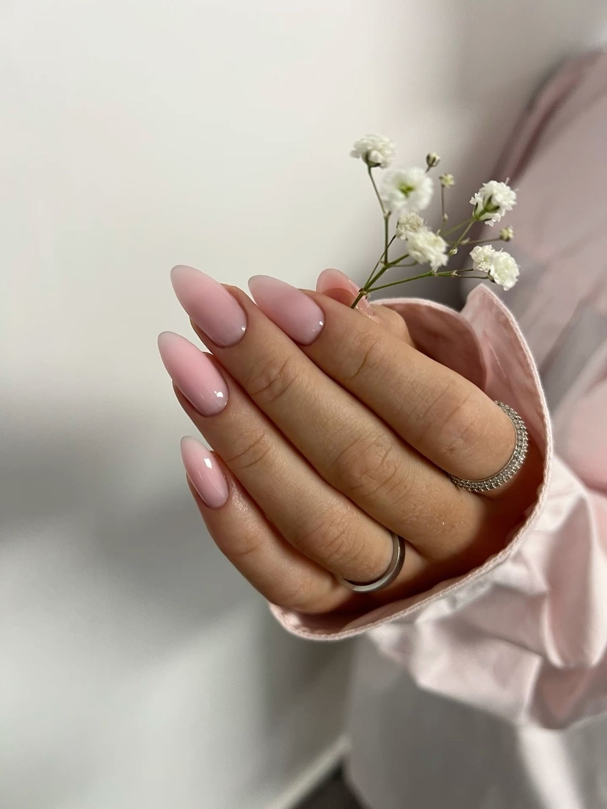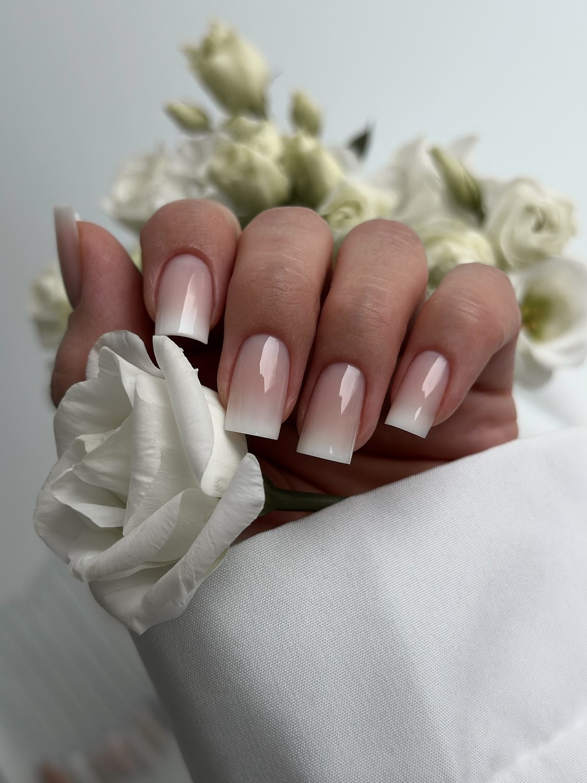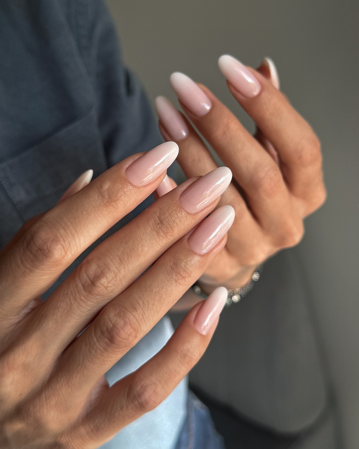 Плавний перехід від більш темного нюдового відтінку біля кутикули до світлого на кінчику нігтя створює ефект природного омбре. Градієнтний нюд візуально подовжує нігтьову пластину і додає дизайну глибини. У холодну пору року особливо актуальні переходи від теплих карамельних тонів до молочно-бежевих або від пильно-рожевих до вершкових відтінків.