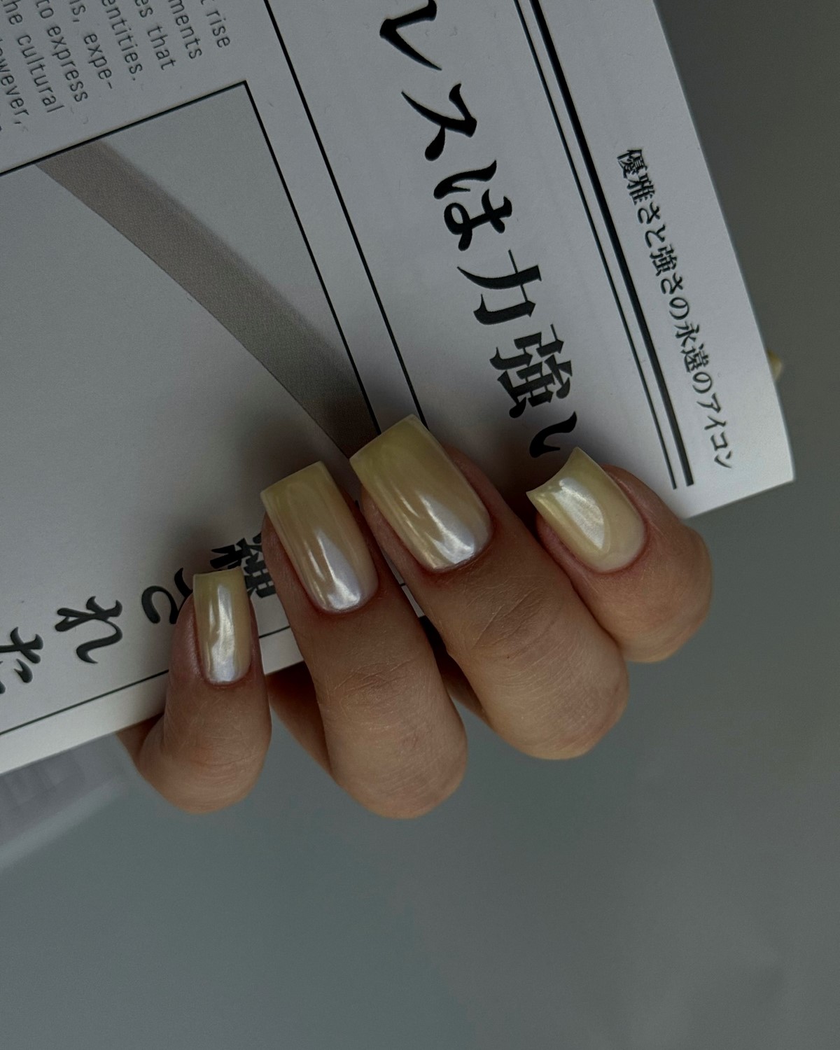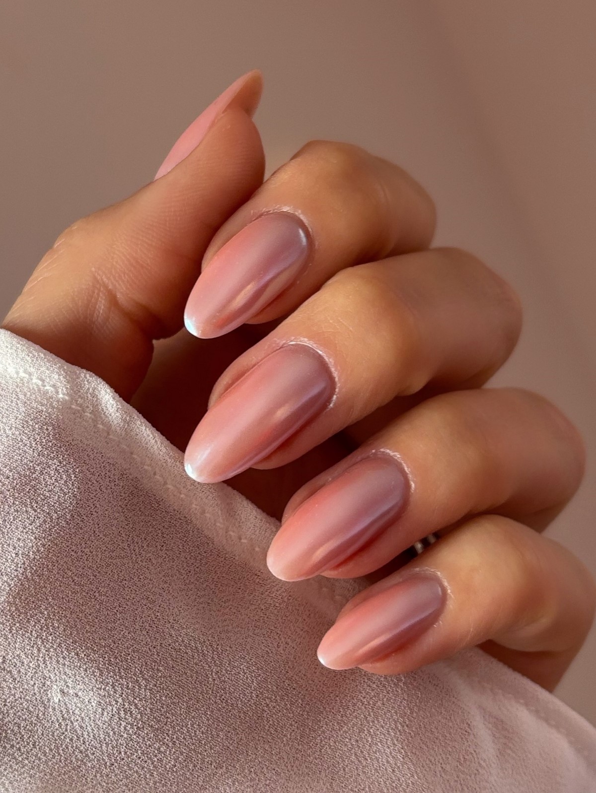 Трендова техніка glass nails створює ефект прозорого, немов скляного покриття з легким мерехтінням. На нюдовій основі цей дизайн виглядає особливо вишукано, надаючи нігтям вологий блиск і багатовимірність. Для досягнення ефекту використовуються спеціальні втирки або пігменти, які наносяться шарами, створюючи ілюзію глибини і сяйва, схожу на поверхню дорогоцінного опалу.
