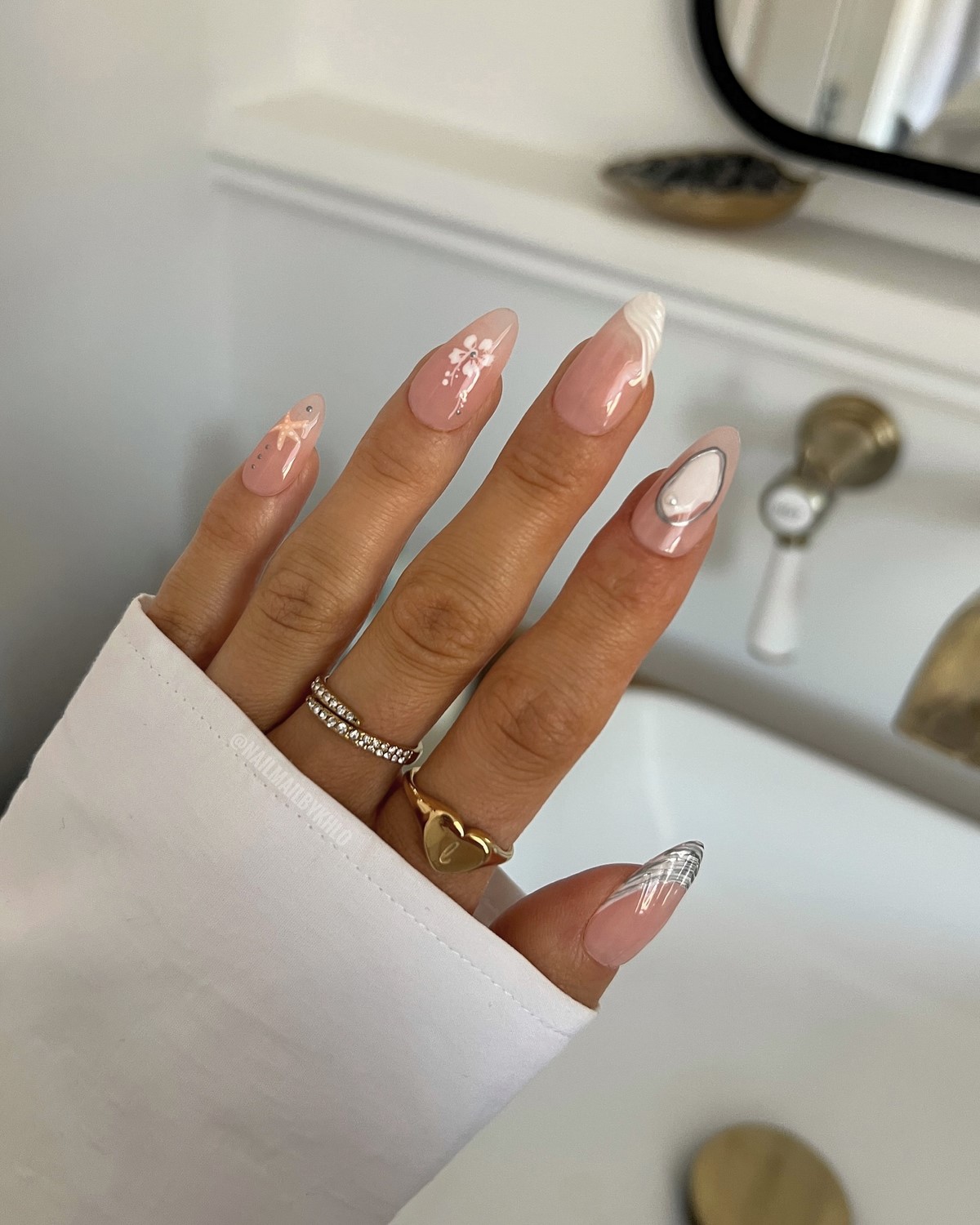 Декор став більш вишуканим і продуманим: в моді мікроблискітки, перлинні акценти, тонкі золоті лінії і мінімалістичні геометричні візерунки. Малюнки і принти тяжіють до природних мотивів — ніжні квіткові композиції, абстрактні розводи, що імітують мармур або агат. Особлива увага приділяється негативному простору, де частина нігтьової пластини залишається непокритою, створюючи ефект легкості та повітряності дизайну.