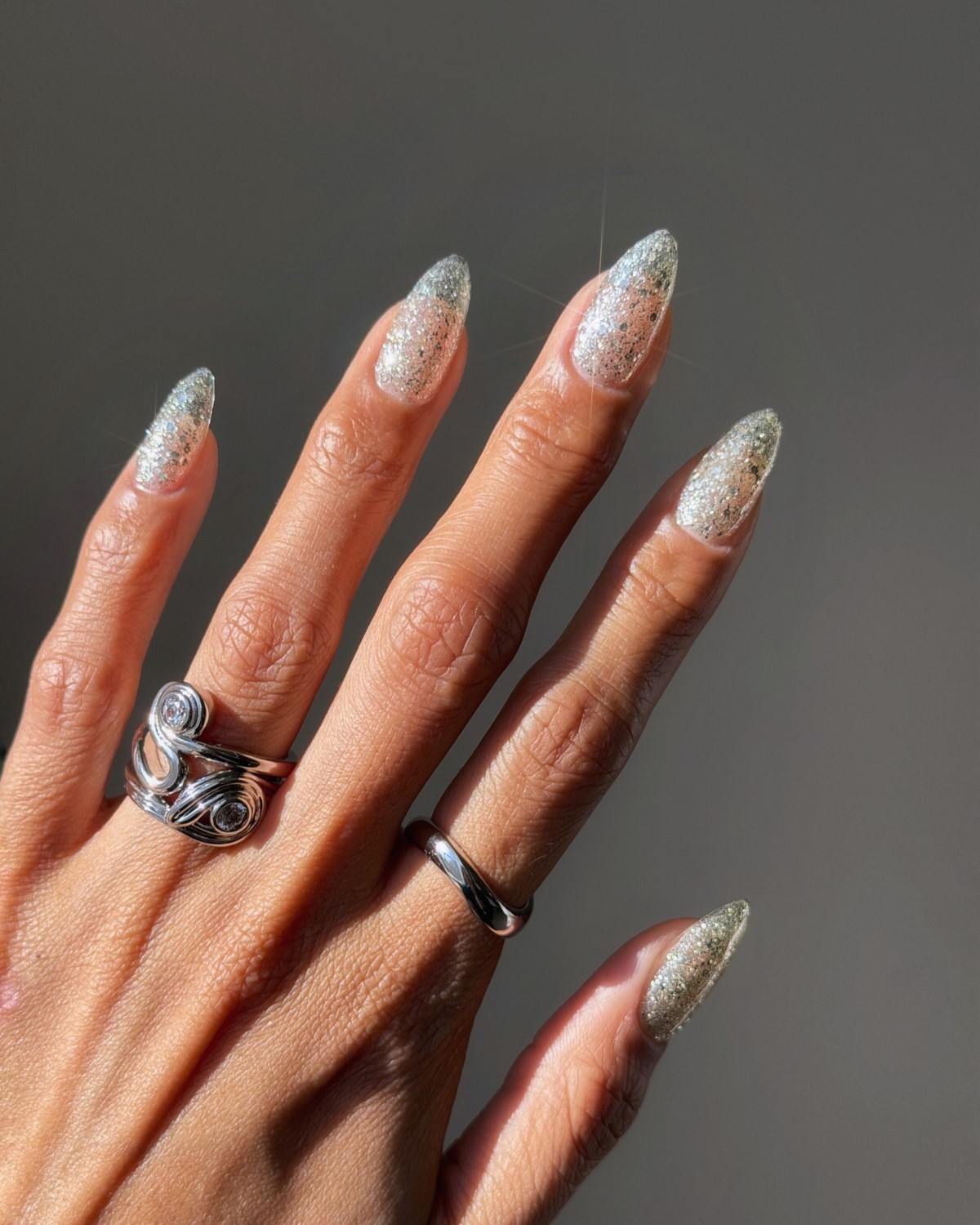 Мініатюрні блискітки біля кутикули стають одним з найелегантніших трендів місяця. Вони створюють легке сяйво, яке красиво відбиває світло, не перевантажуючи манікюр. Зазвичай використовується сріблястий, шампанський або перловий блиск.