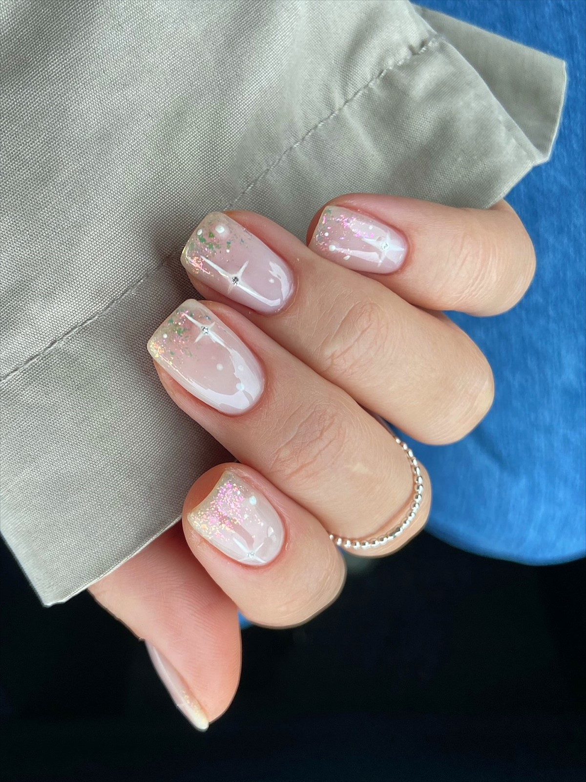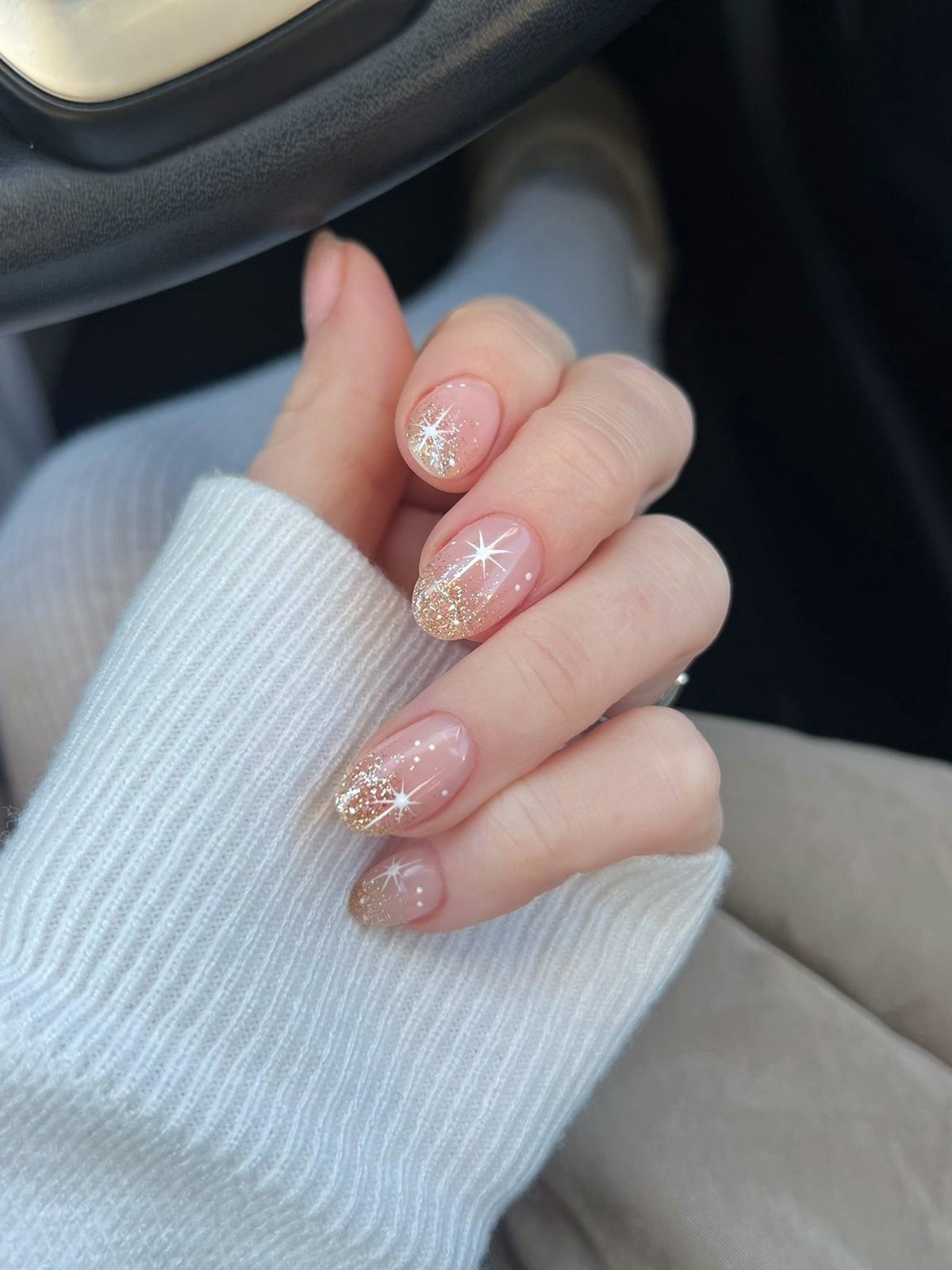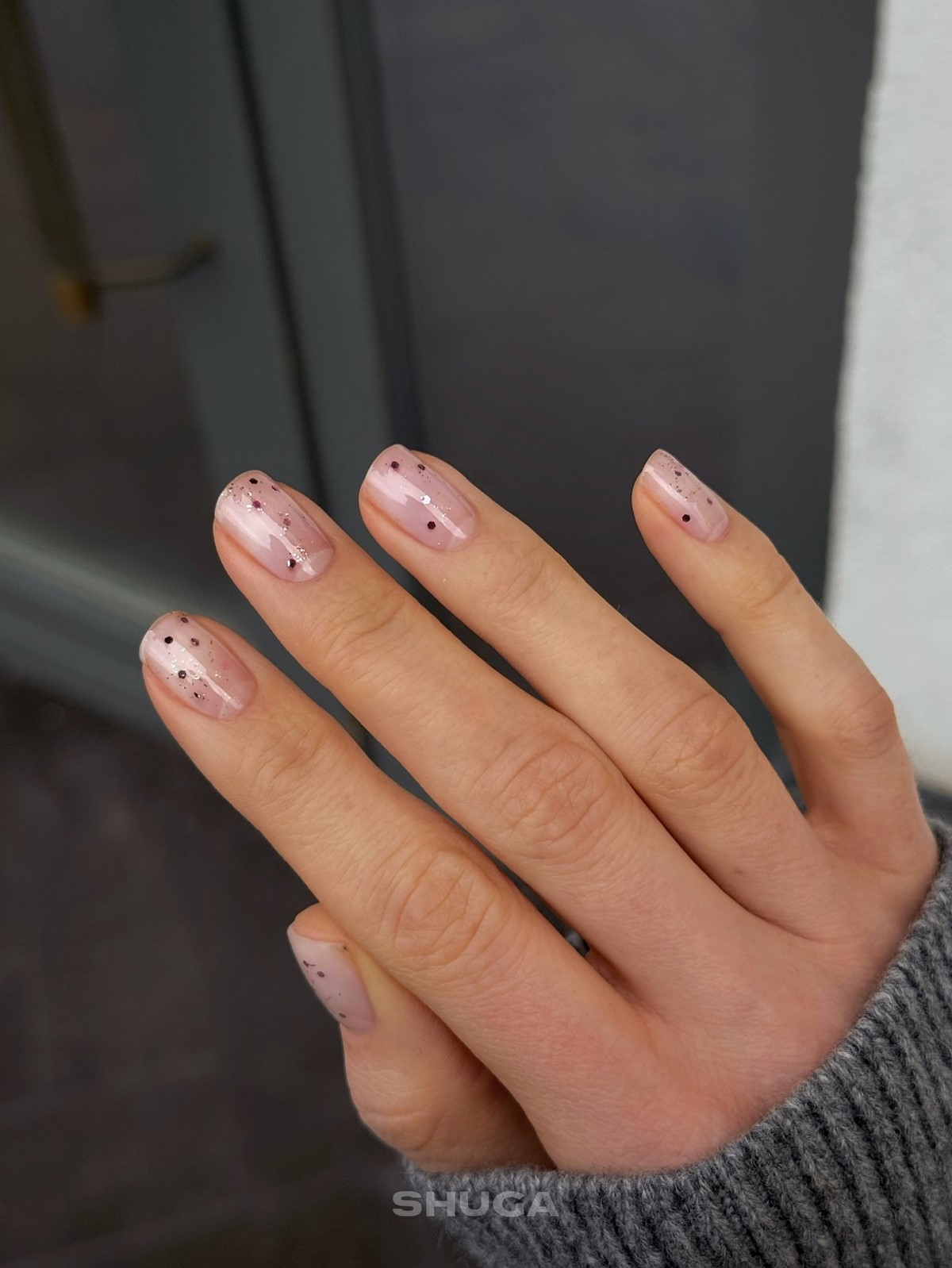 Блискітки в зимовому сезоні 2026 набувають більш витонченого характеру. У моді дрібний, майже пилоподібний шиммер, який немов підсвічує нігті зсередини. Найчастіше його використовують на прозорій, молочній або нюдовій основі.