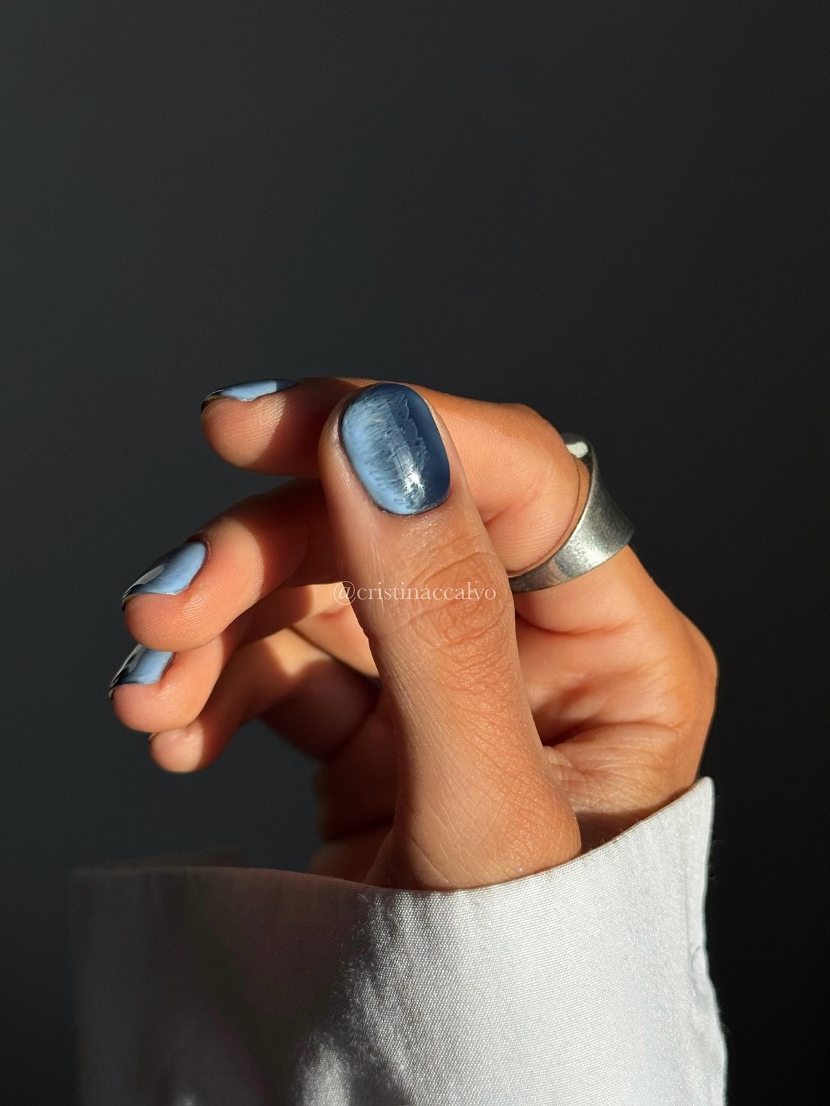 Блакитний відтінок асоціюється із зимовим повітрям і холодним світлом. У 2026 році він використовується в складних, приглушених тонах. Такий манікюр освіжає образ і робить його більш сучасним.