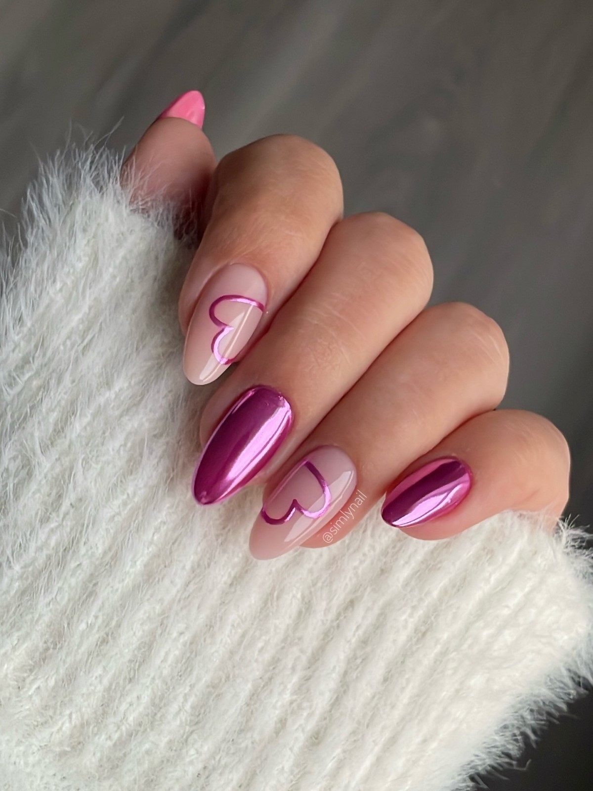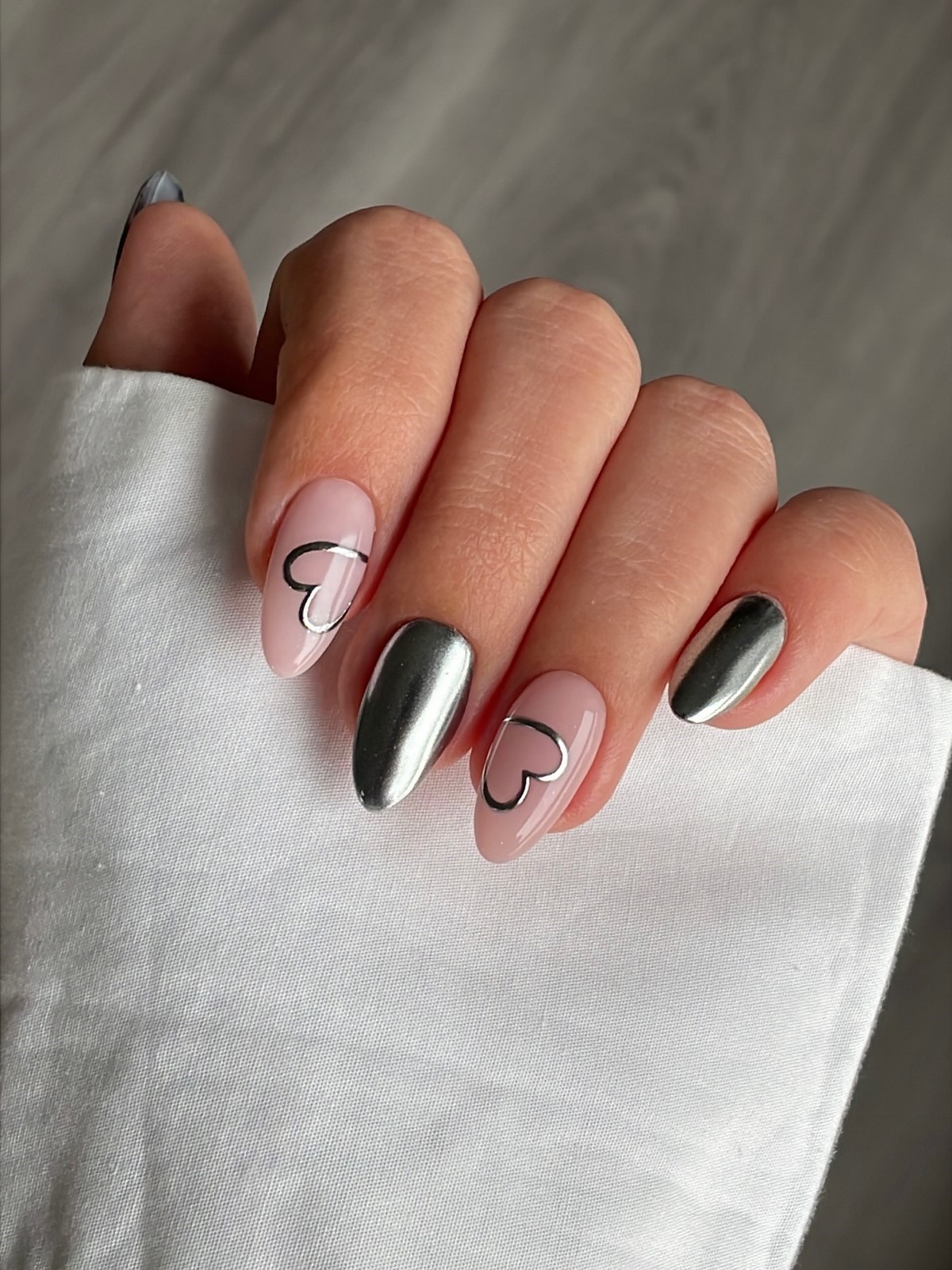 Металеві сердечка стають стильним акцентом в романтичному манікюрі. Золото, срібло і рожевий металік використовуються як тонкі лінії, міні наклейки або у вигляді фольги. Такий дизайн виглядає ефектно, але не перевантажує образ.