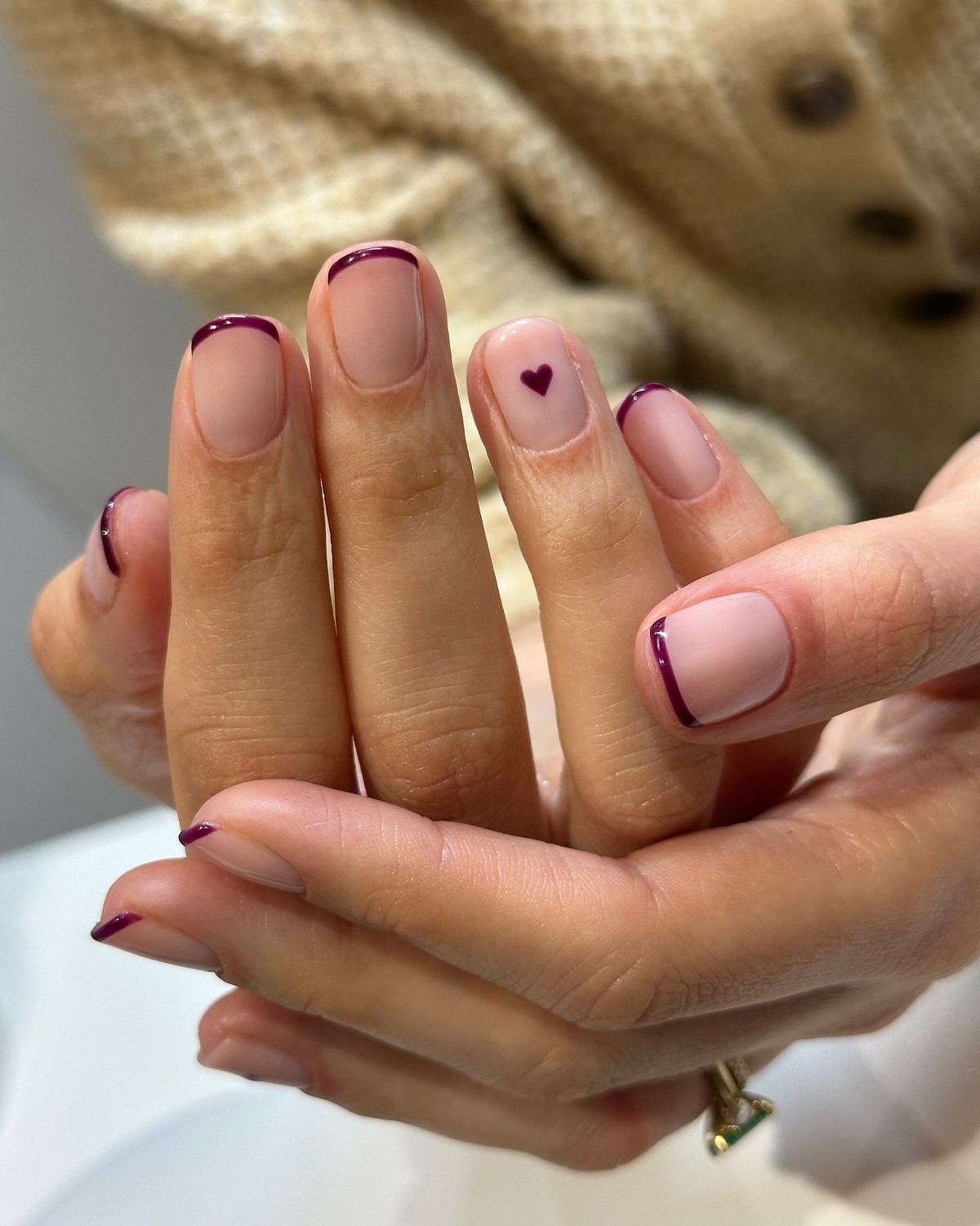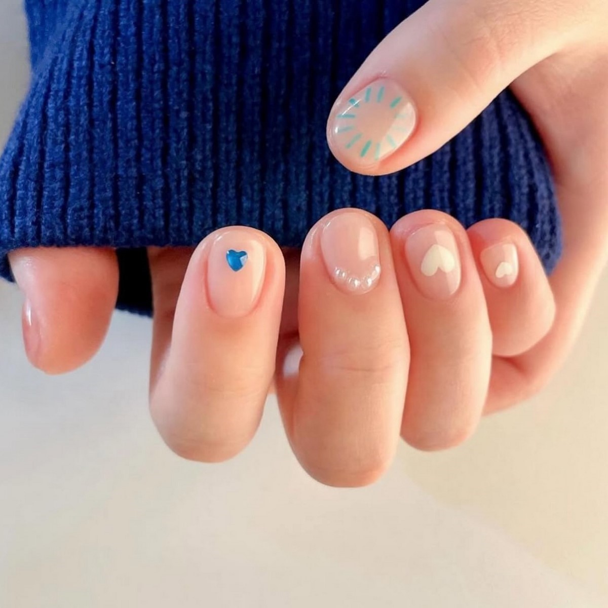 Мінімалістичний манікюр з сердечками залишається одним з найпопулярніших варіантів сезону. Маленькі сердечка, виконані в одному кольорі з покриттям або на нюдовій основі, виглядають акуратно і непомітно. Такий дизайн ідеально підходить для коротких нігтів і повсякденного образу.