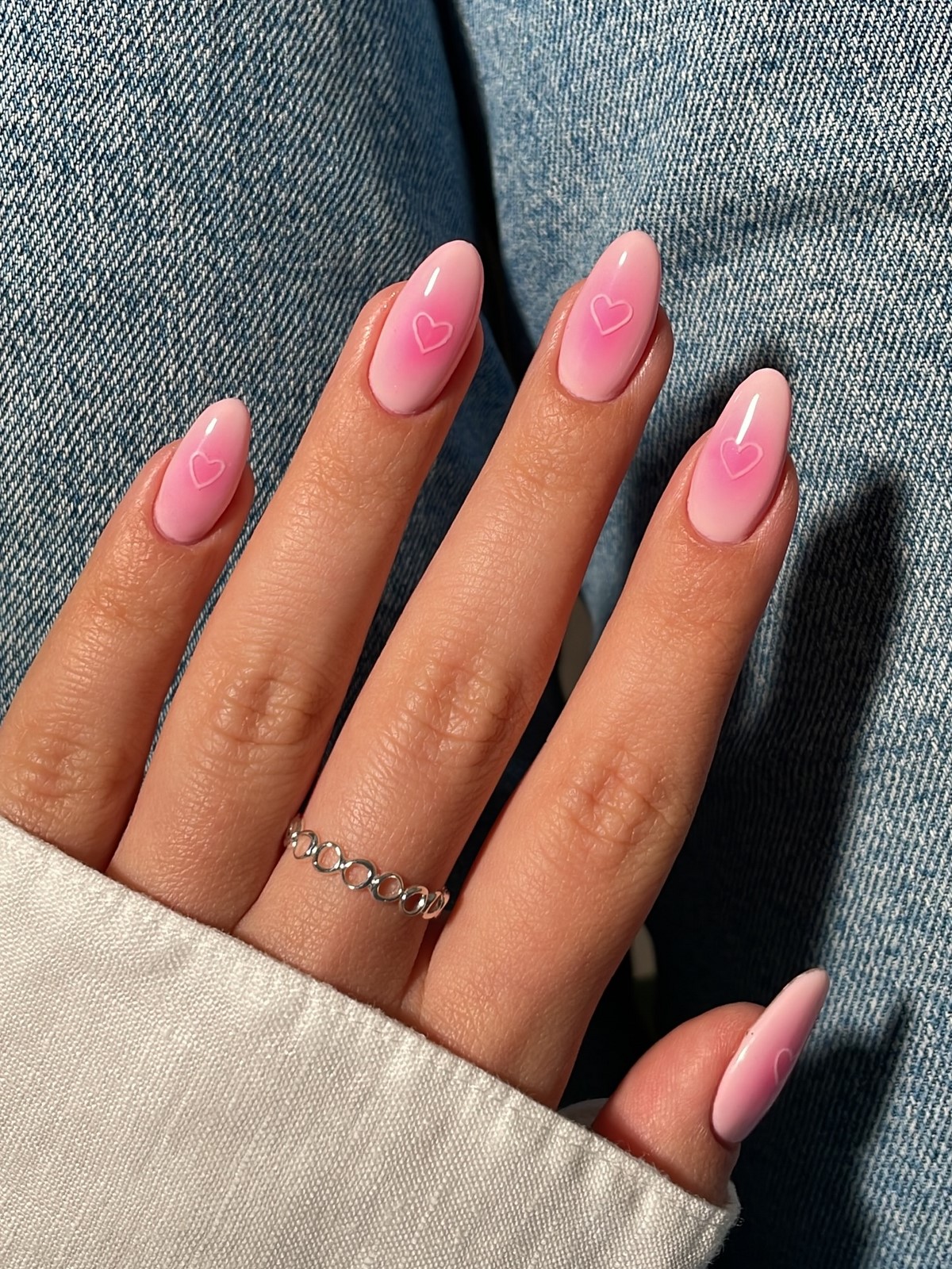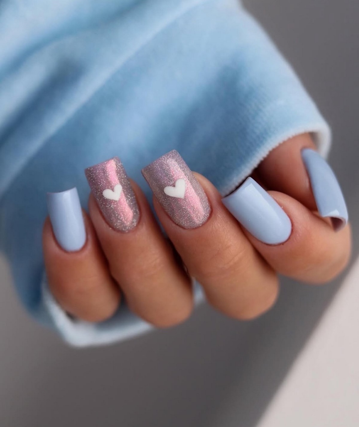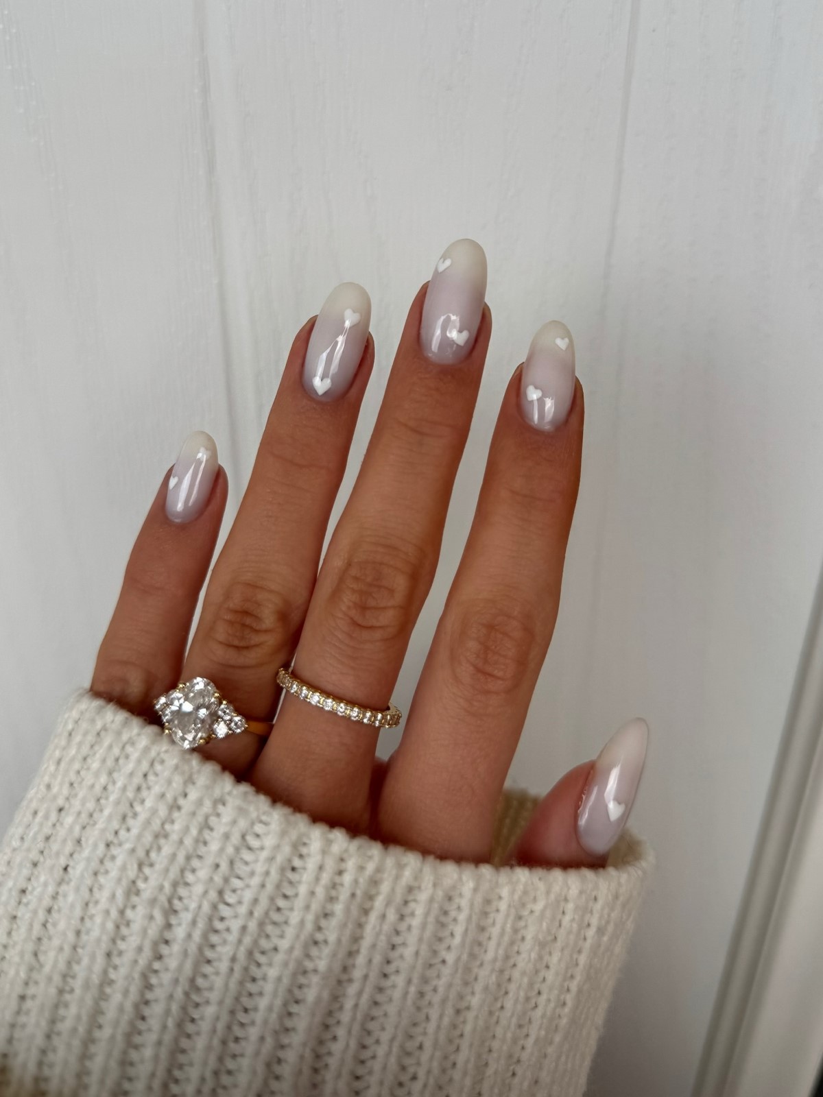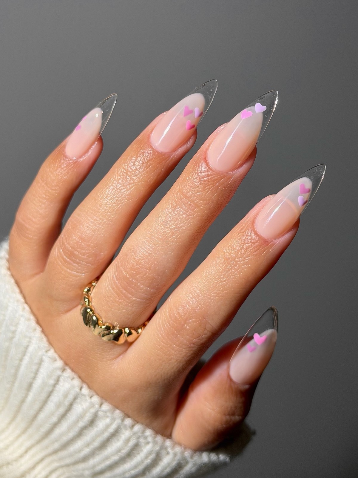 Найчастіше використовується прозора основа з легким молочним або рожевим підтоном. Сердечка можуть бути мініатюрними або графічними, залежно від настрою образу.