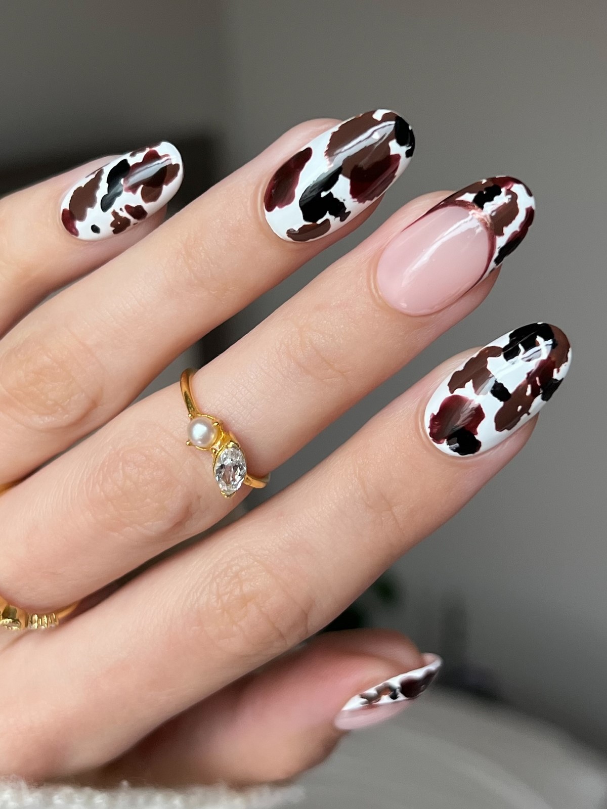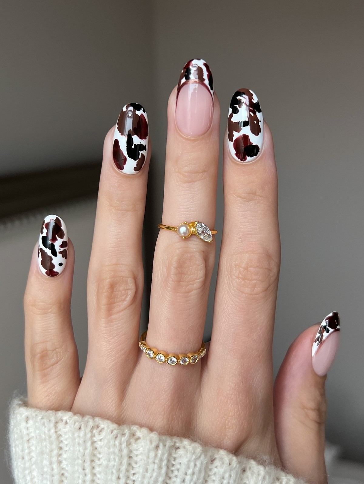 Коров’ячий принт в коричневій гамі продовжує набирати популярність і в січні 2026 року. Замість контрастного чорно-білого варіанту використовуються м’які шоколадні і молочні відтінки. Це робить дизайн більш спокійним і адаптованим під зимовий сезон.