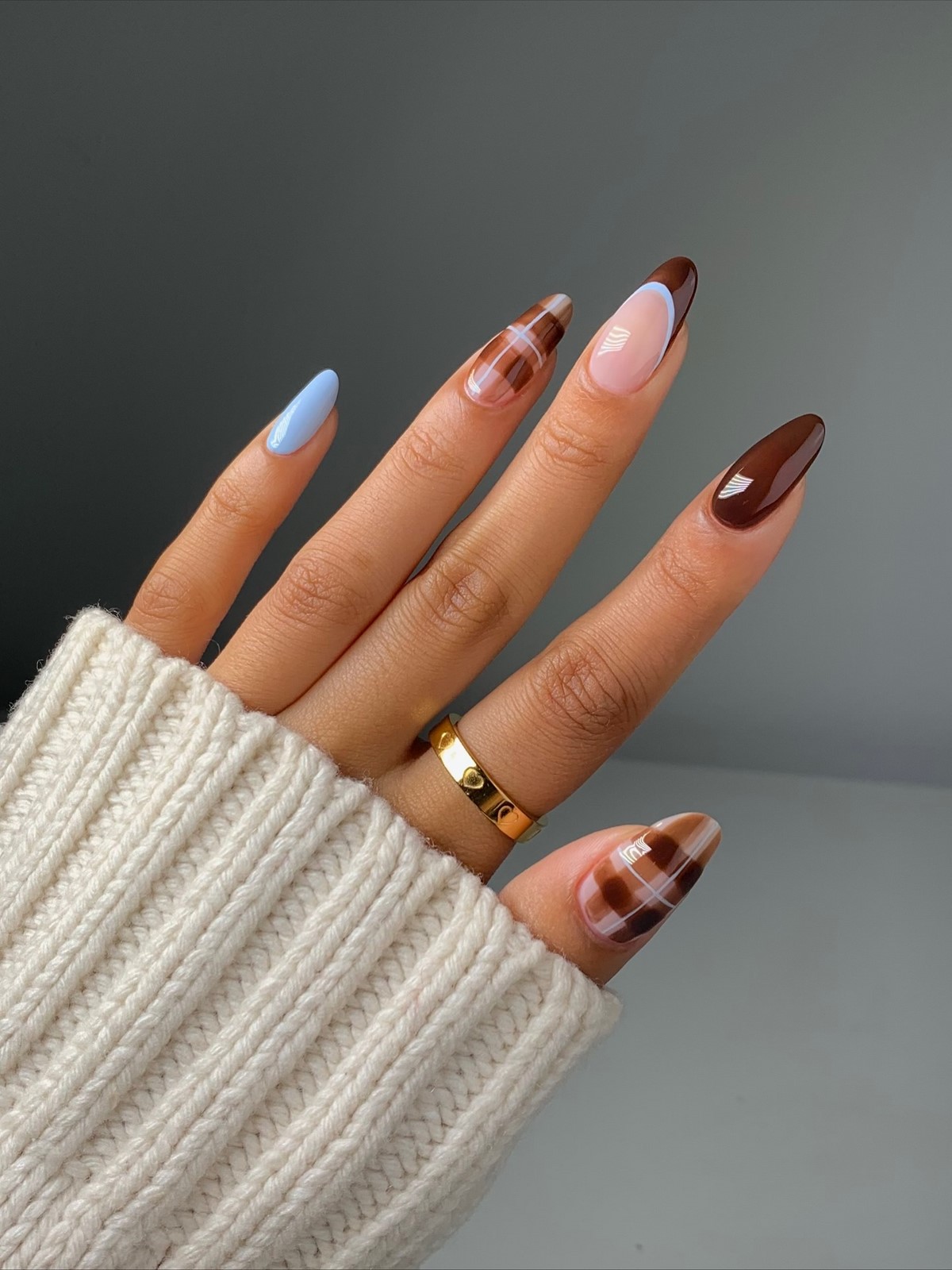 Шоколадний манікюр на мигдалевих нігтях