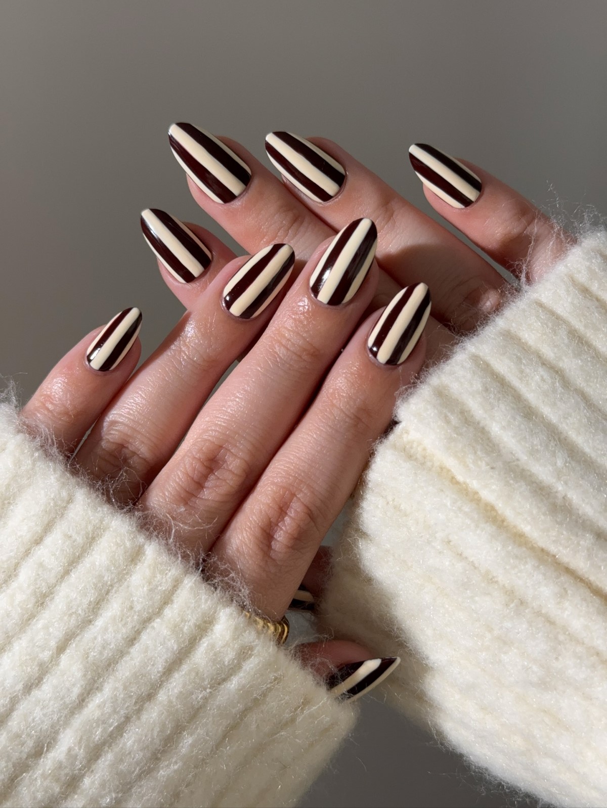 Поєднання ванільного і шоколадного відтінків стає одним з найзатишніших трендів січня. Тонка світла смужка на коричневому тлі виглядає ніжно і стильно. Такий дизайн асоціюється з теплом і комфортом зимових днів.