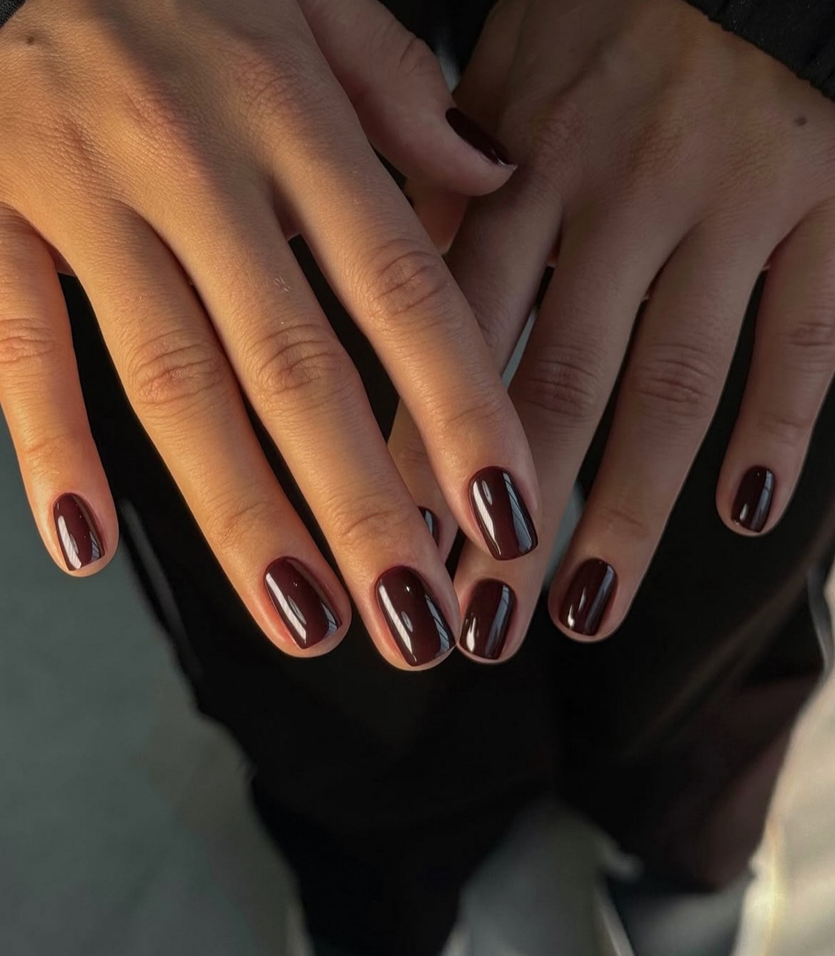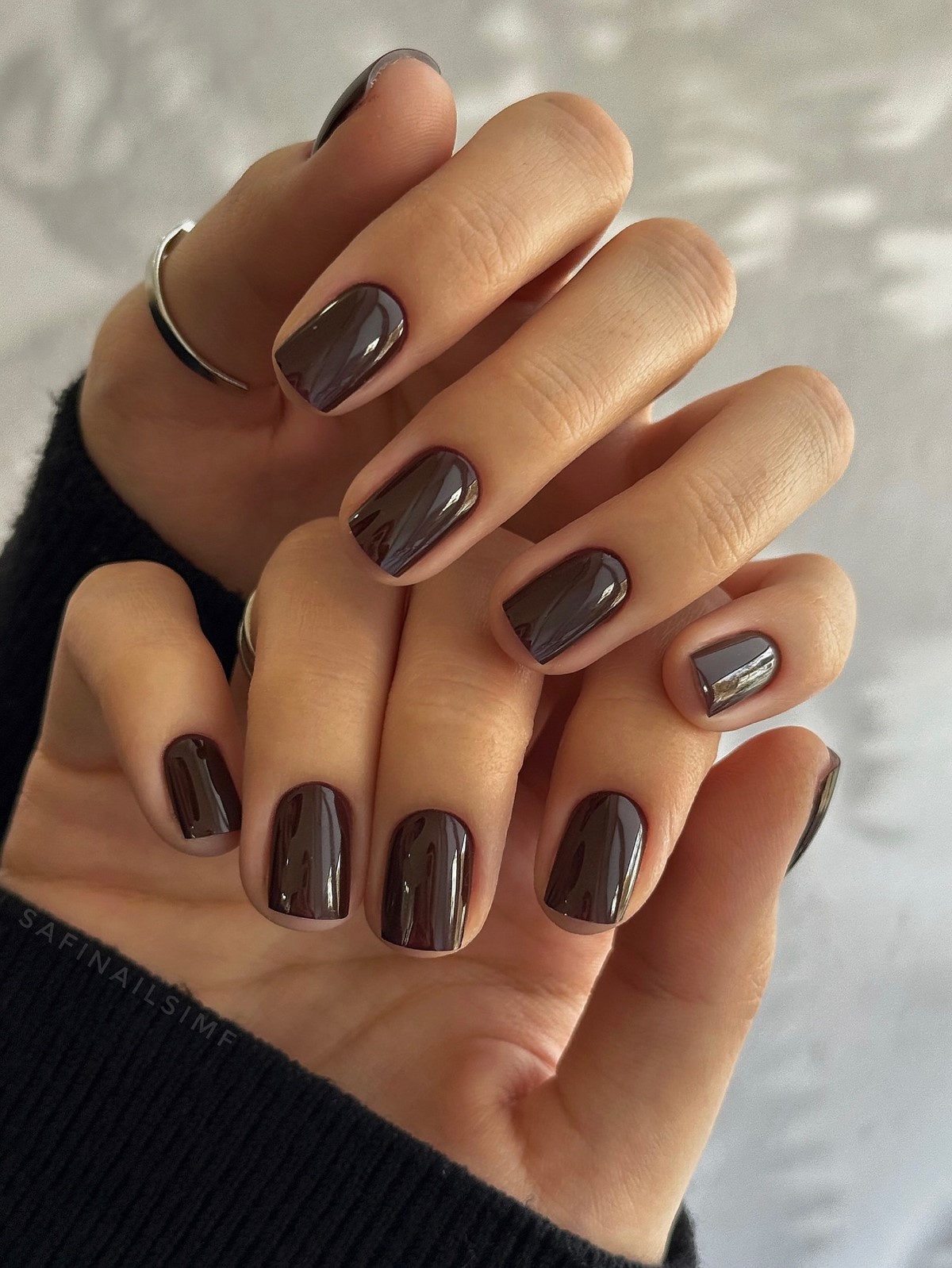 Теплі шоколадні відтінки ідеально підходять для зимового сезону. Вони виглядають благородно, затишно і візуально роблять нігті доглянутими. Матовий або глянцевий фініш однаково добре розкриває глибину кольору.