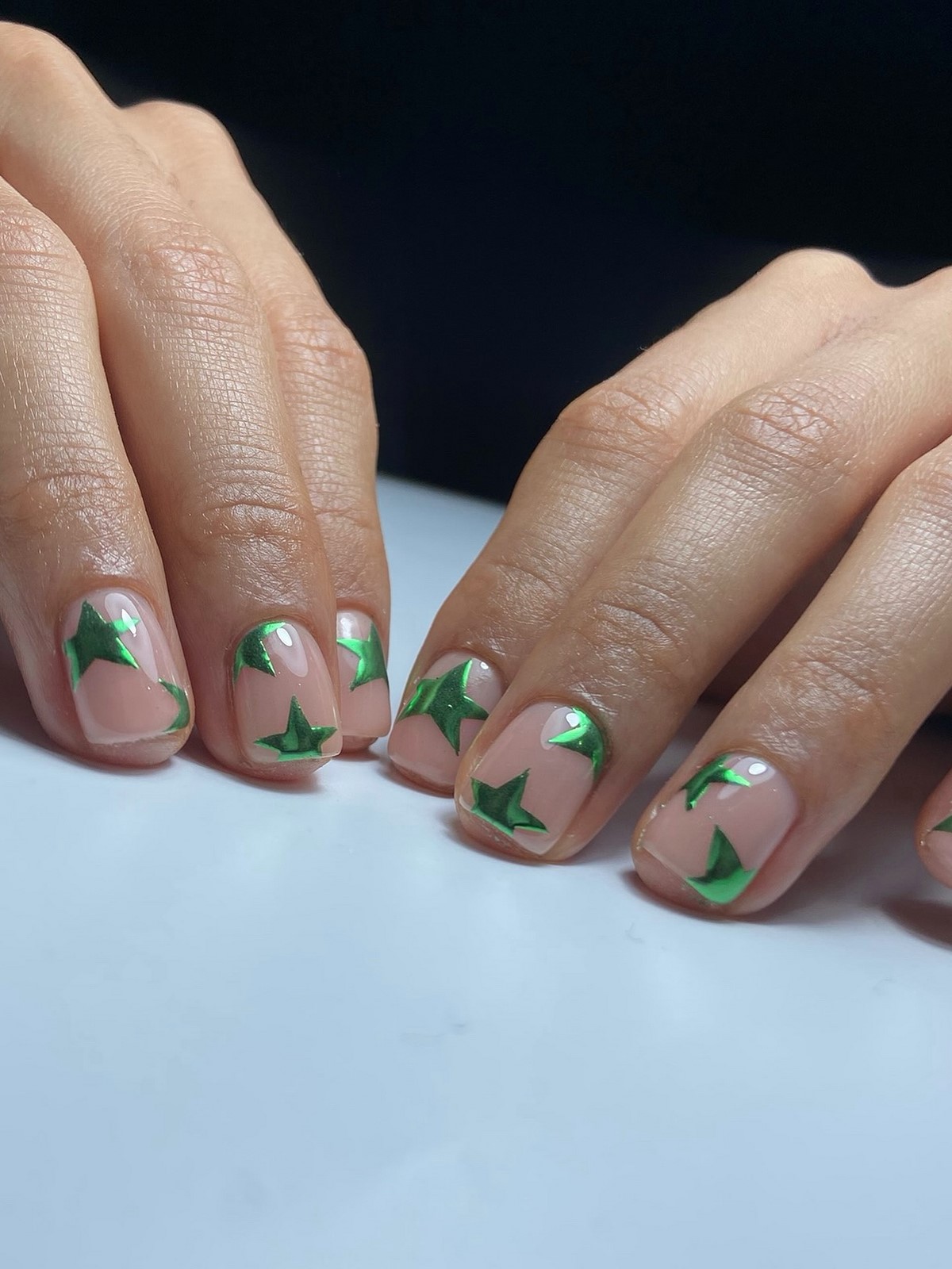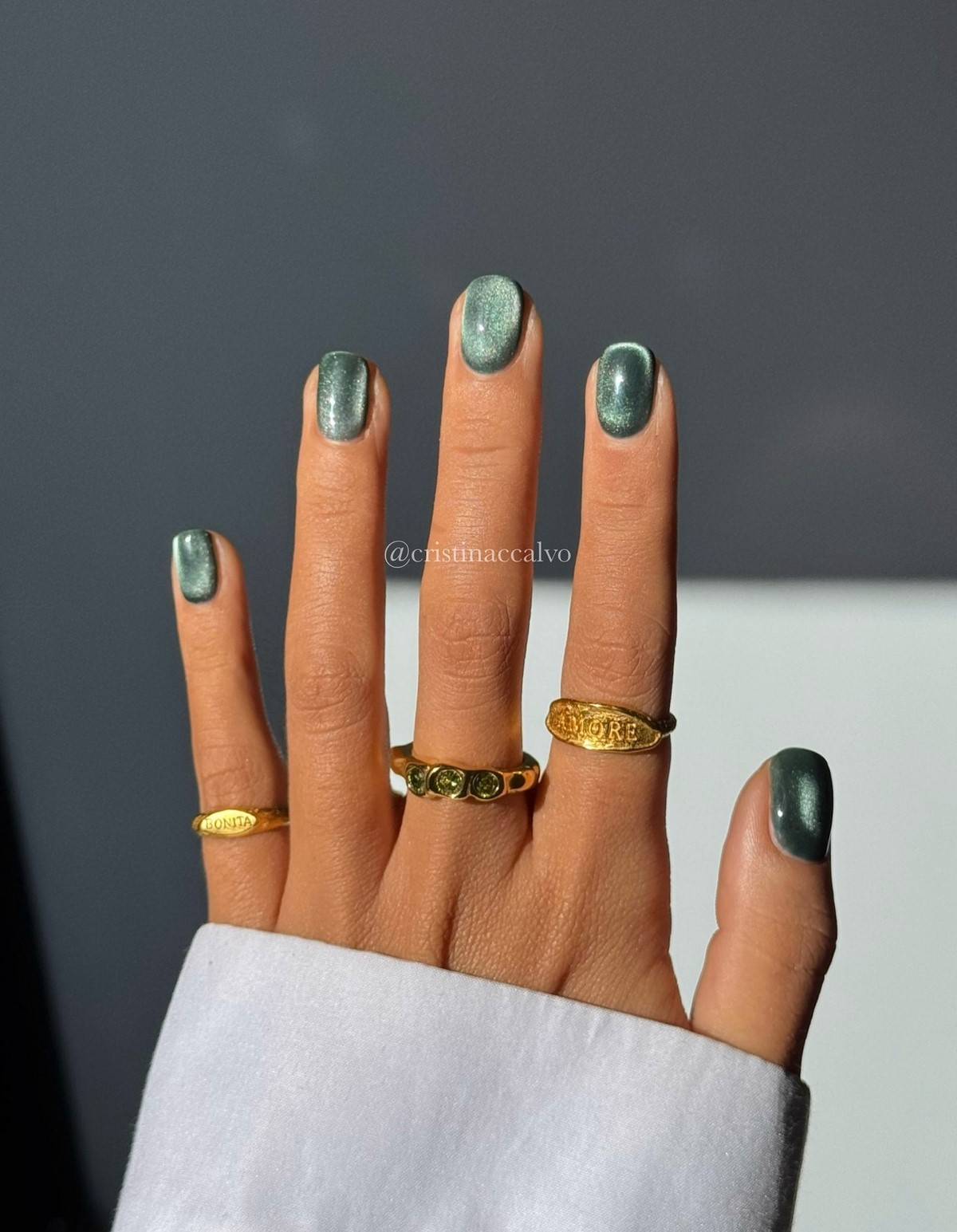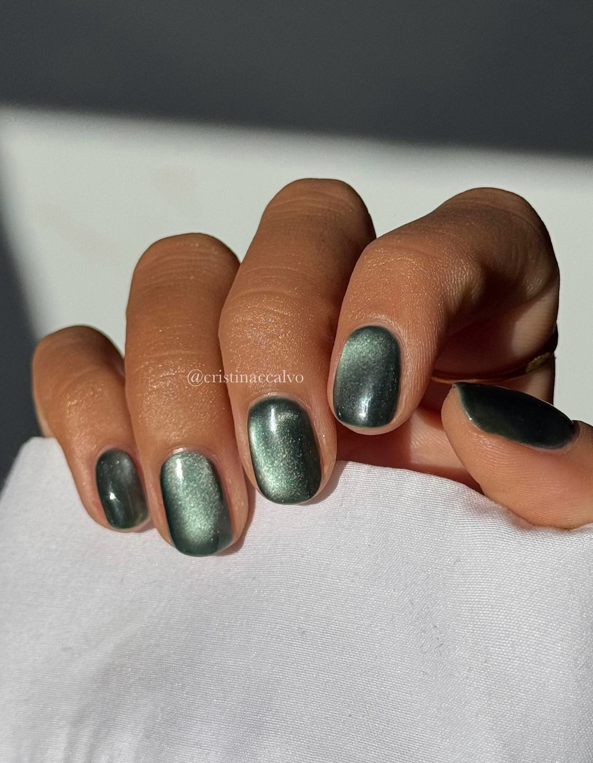 Глибокі зелені відтінки, від хвойного до пляшкового, стають вибором впевнених у собі дівчат. Такий колір асоціюється з дорогими тканинами і природною розкішшю. На коротких нігтях він виглядає особливо акуратно і стильно.