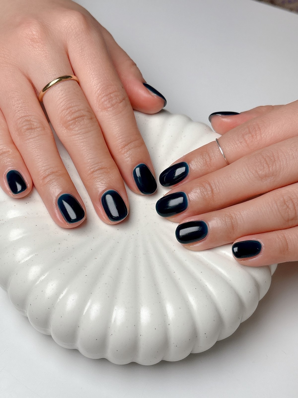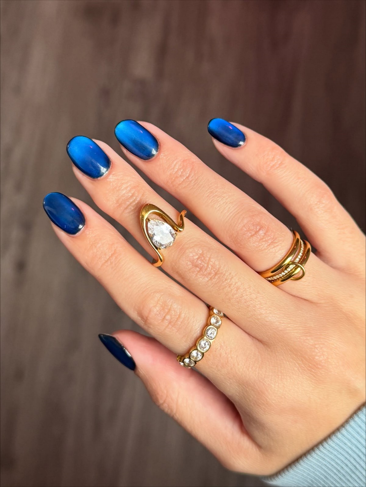 Темно-синій і сапфіровий відтінки надають манікюру холодну елегантність. У лютому 2026 актуальні покриття з м’яким глянцем або легким сатиновим ефектом. Цей варіант відмінно підходить для вечірніх і ділових образів.