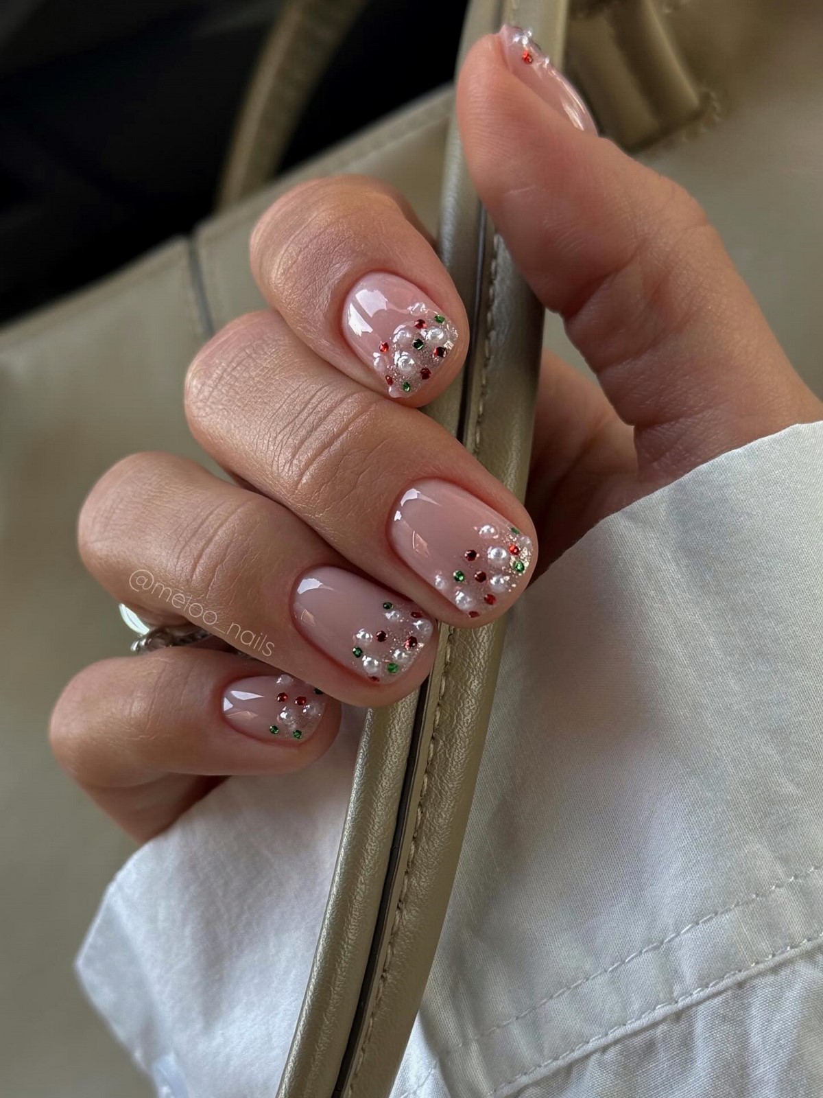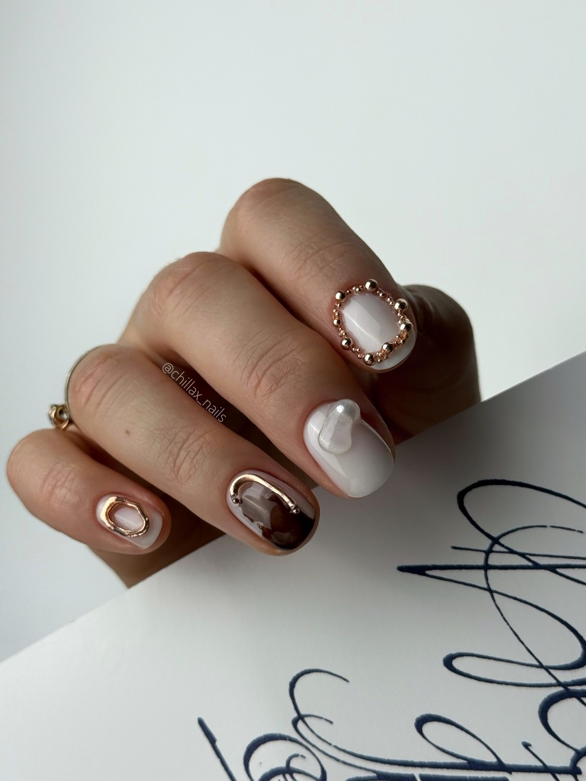 Дрібні перлини і намистини стають акцентом на одному або двох нігтях. Вони додають манікюру статусності і асоціації з високою модою. На коротких нігтях важливо дотримуватися балансу і не перевантажувати композицію.