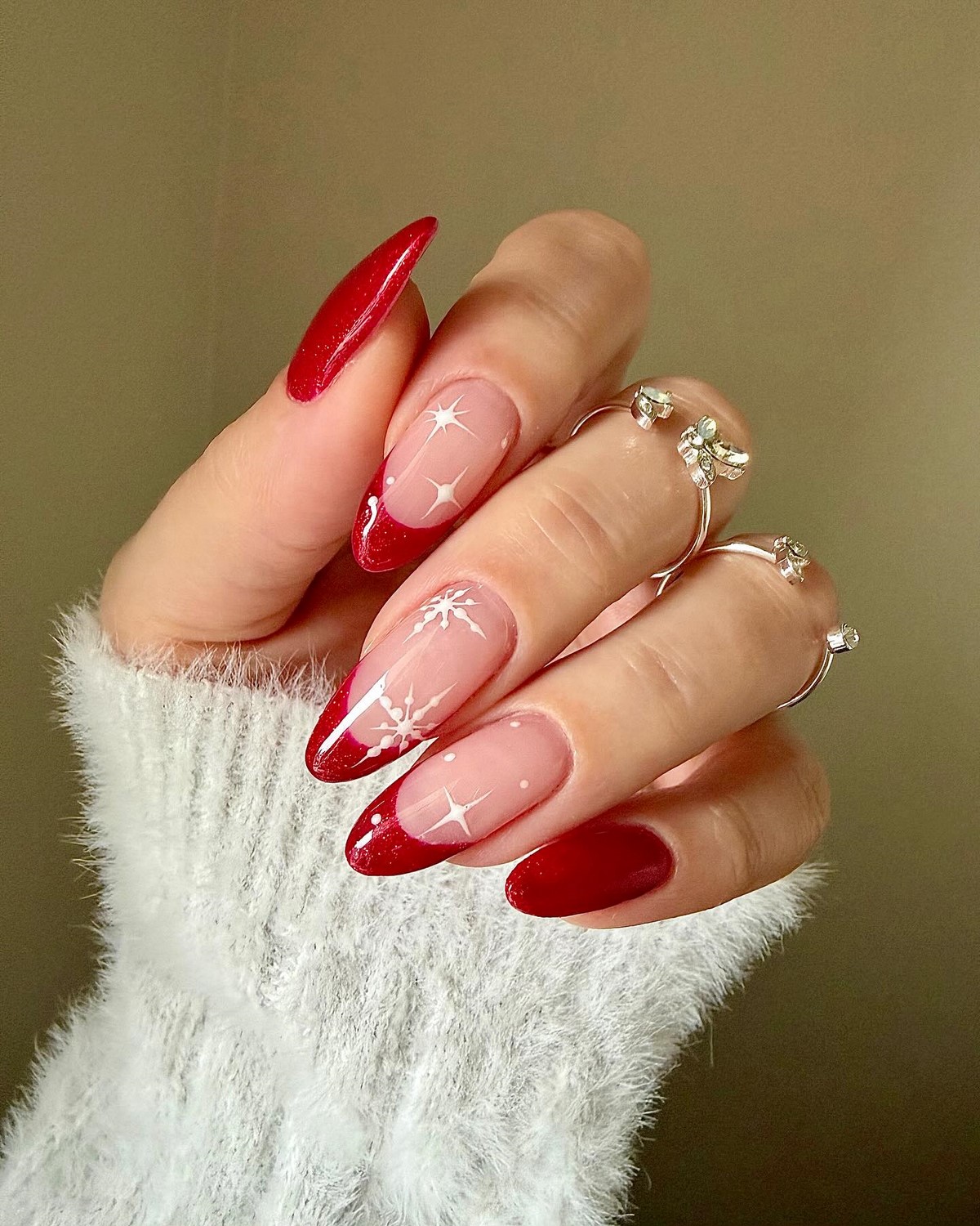Червоний манікюр зі сніжинками залишається класикою зимового сезону. У 2026 році популярні ультратонкі білі сніжинки, виконані гель-павутинкою або 3D-гелем. Такий декор робить нігті повітряними і в той же час святковими.