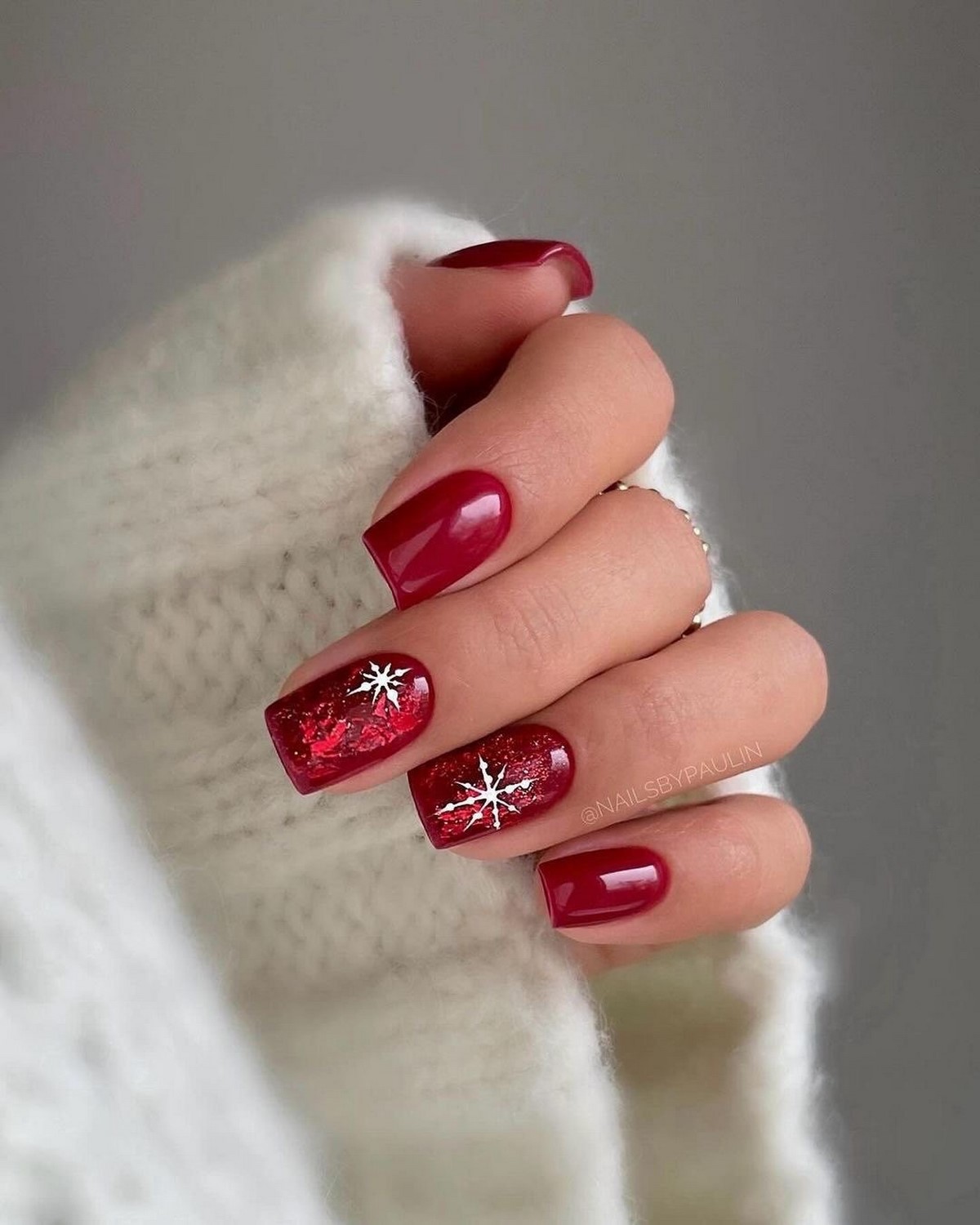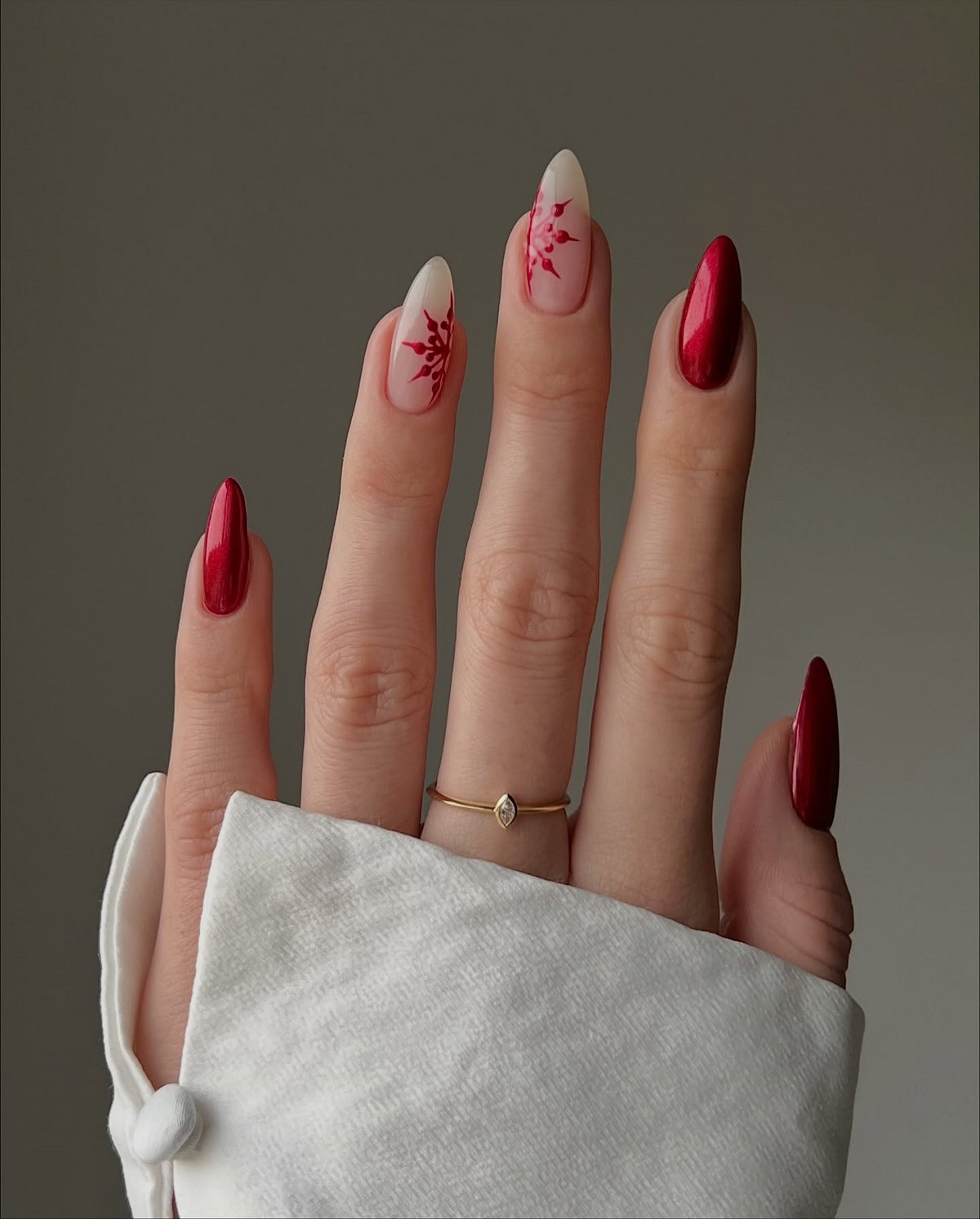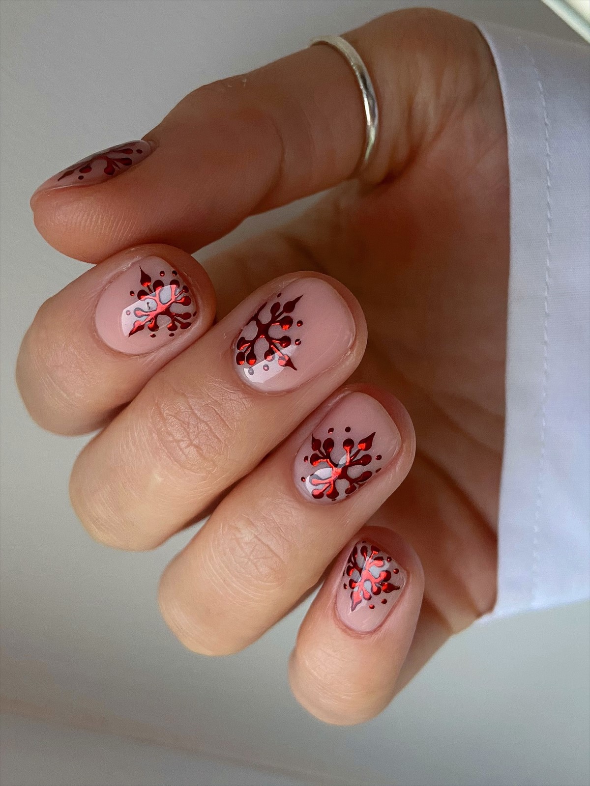 Червоний манікюр зі сніжинками залишається класикою зимового сезону. У 2026 році популярні ультратонкі білі сніжинки, виконані гель-павутинкою або 3D-гелем. Такий декор робить нігті повітряними і в той же час святковими.