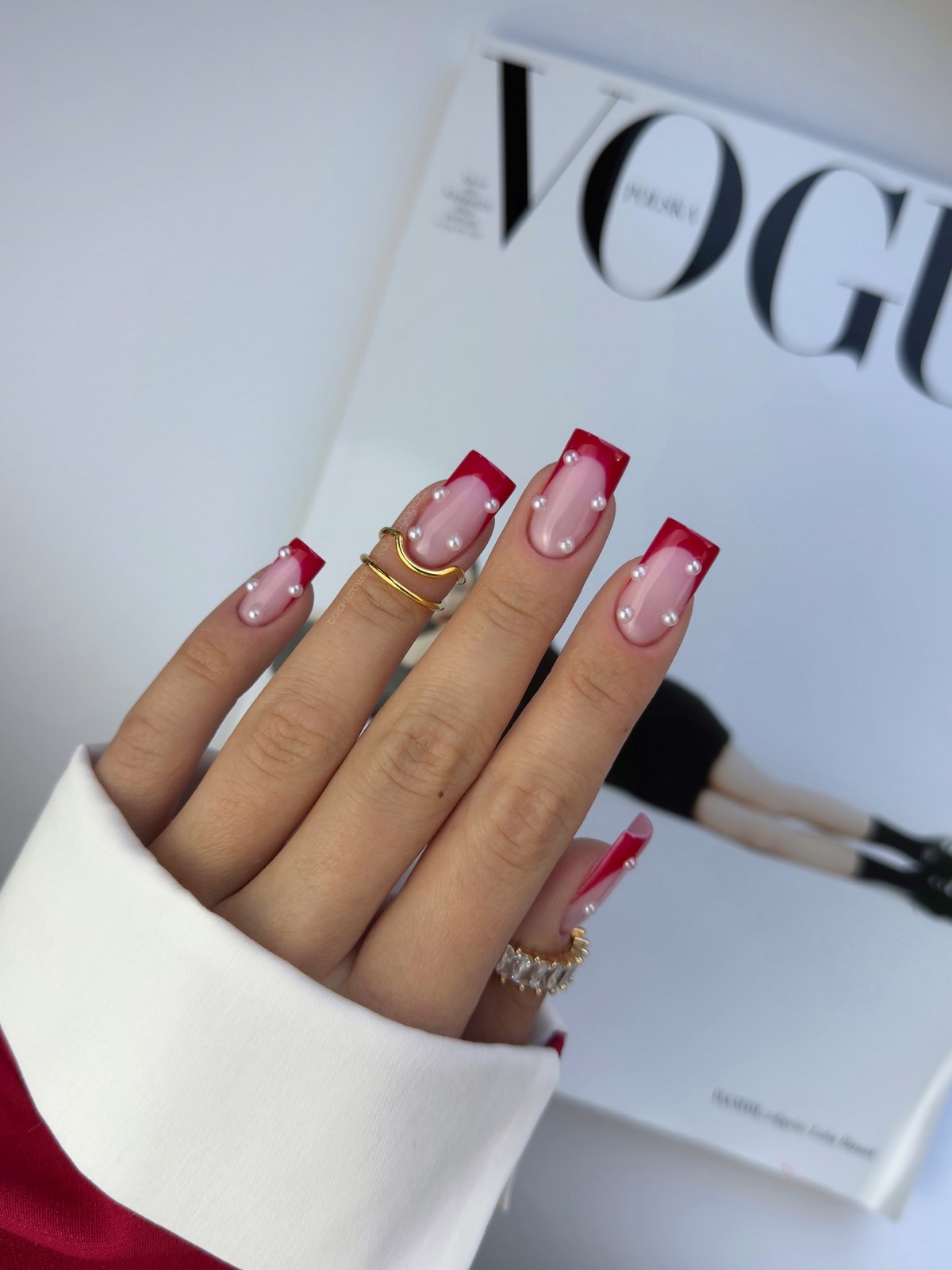 Перли підкреслюють благородство червоного кольору. Невеликі перлини викладають біля основи нігтя, уздовж центральної лінії або використовують як одиничний акцент. Такий варіант підходить як до коктейльних, так і до вечірніх нарядів.