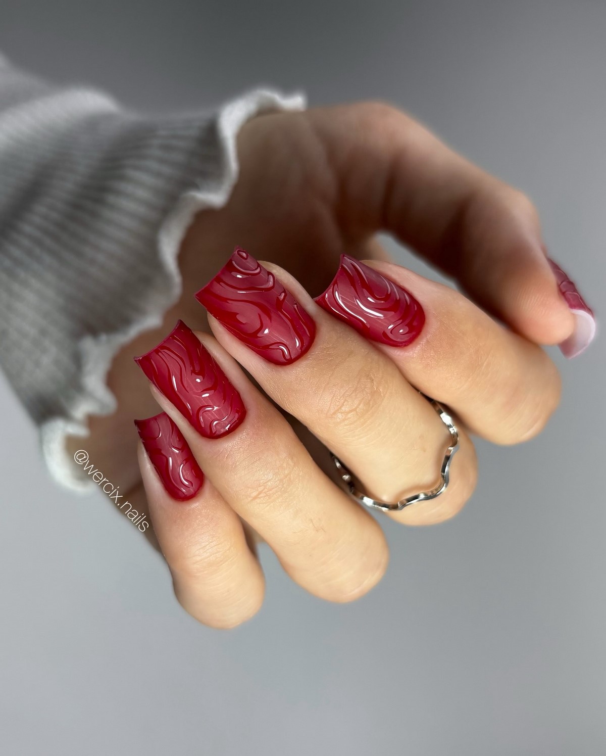 Цікаво: майстри відзначають, що текстурний червоний манікюр найкраще розкривається на середніх і мигдалевих формах — фактура виглядає багатшою і дорожчою, ніж на коротких квадратних нігтях.