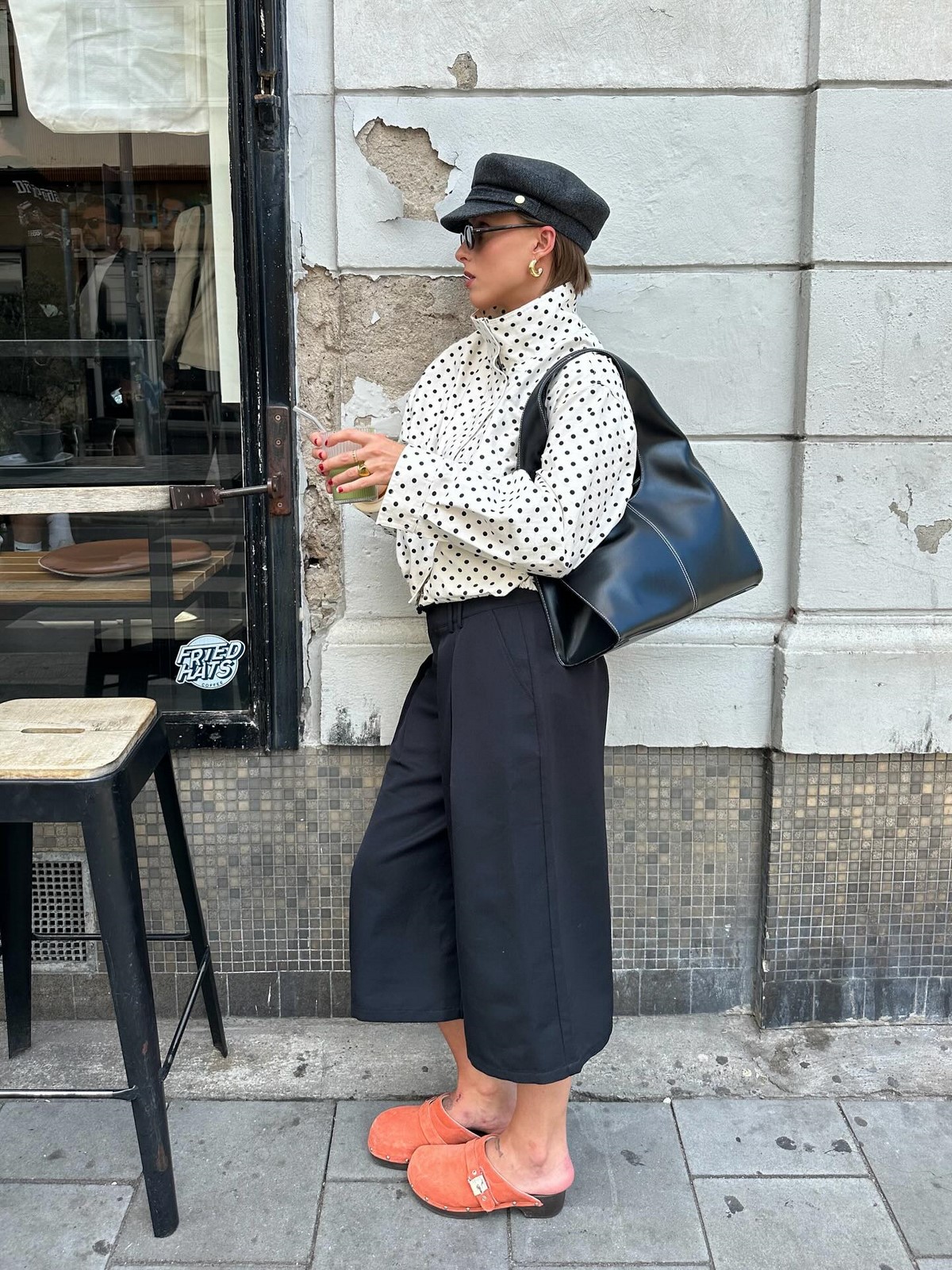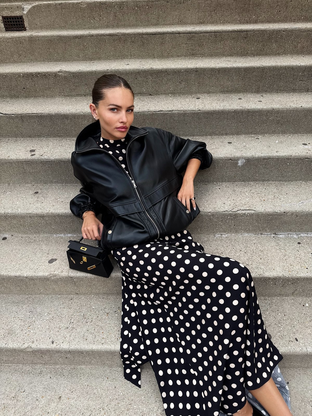 Ретро-принт в горох отримав нову інтерпретацію — тепер він з’являється не тільки на сукнях, але і на блузах, брюках і аксесуарах. У сезоні осінь-зима 2025-2026 дизайнери роблять ставку на великий і контрастний горох, який відразу привертає увагу. Його часто комбінують зі шкірою або строгими силуетами, щоб додати образу динаміки.