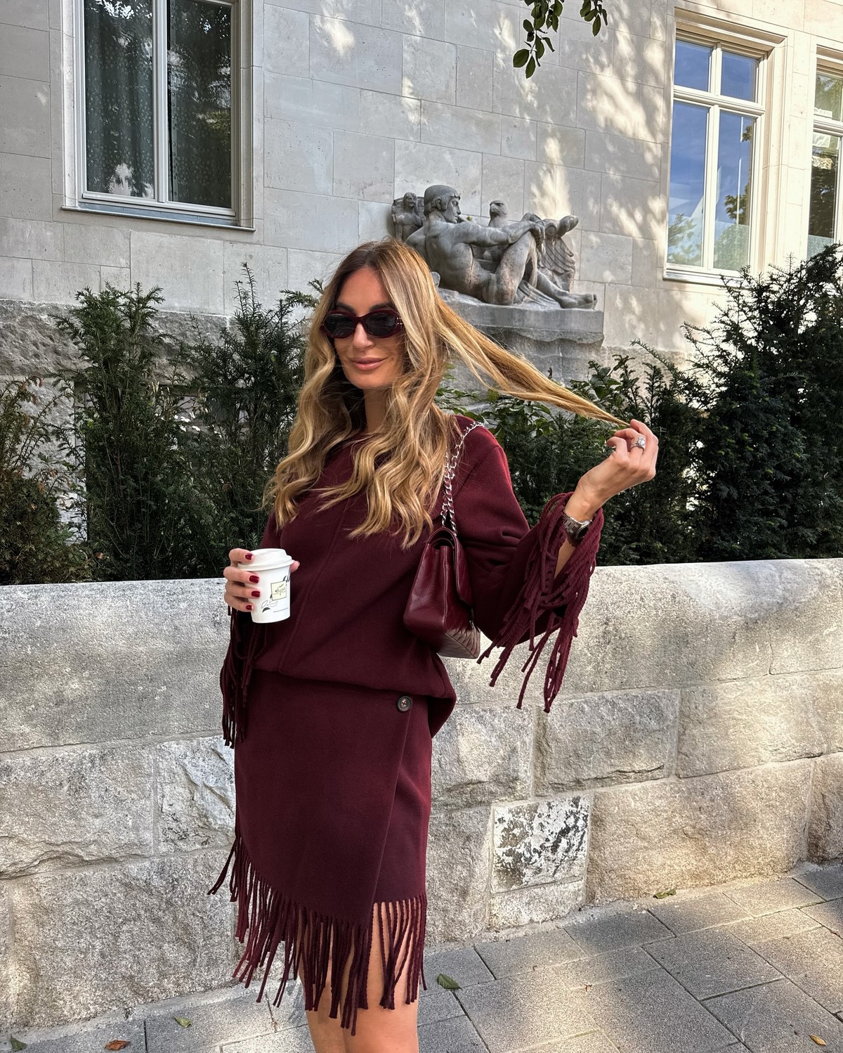 Бахрома продовжує захоплювати модний подіум, стаючи символом руху і динаміки. У сезоні 2025-2026 вона прикрашає спідниці, сукні, пальта і навіть аксесуари. Довга і багатошарова бахрома робить образ грайливим і виразним, особливо в поєднанні з гладкими тканинами.