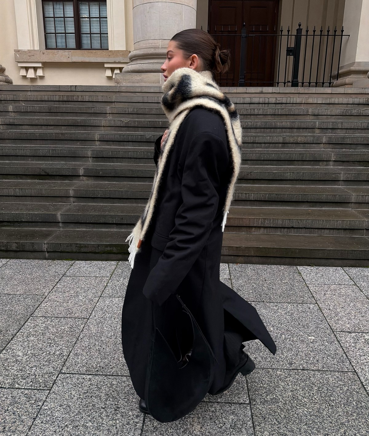 Об’ємні, довгі шарфи з бахромою повертаються в моду і стають справжнім statement-аксесуаром. У 2026 році вони виглядають ще більш виразно: збільшена довжина, щільні тканини, помітна фактура.