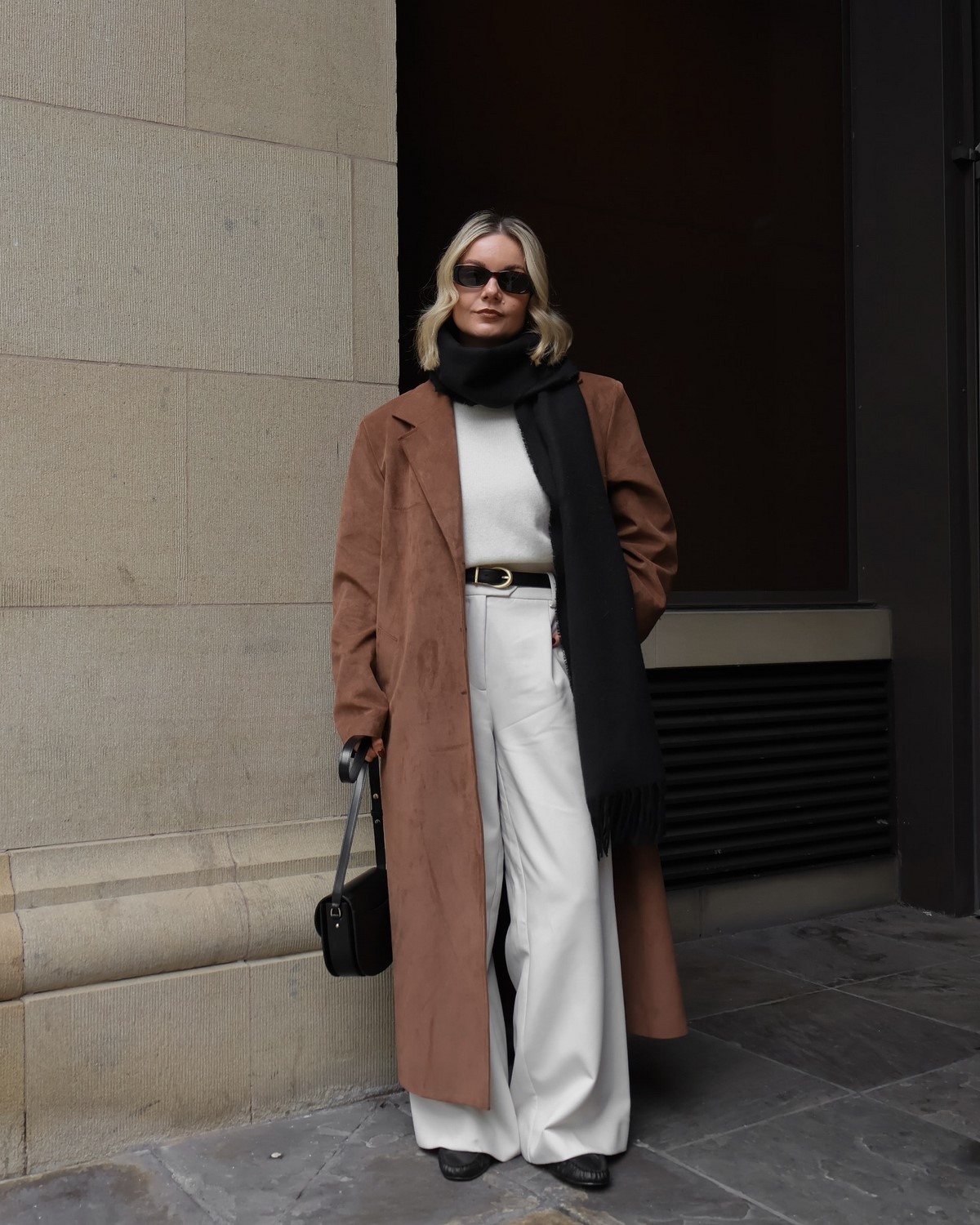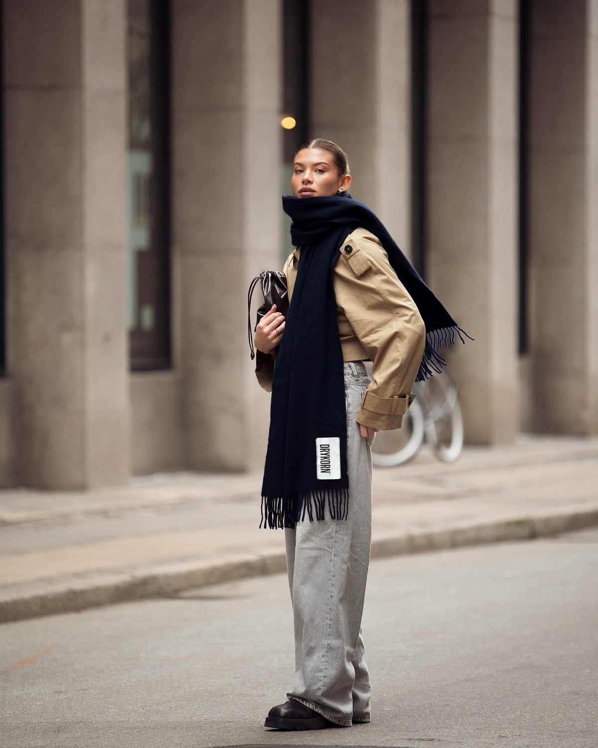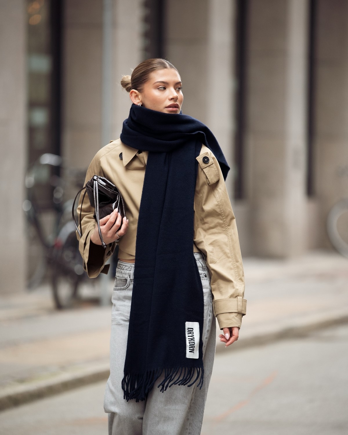 Крім естетики, у такого рішення є і практичний плюс: шарф не сповзає і завжди виглядає акуратно, навіть в активному міському ритмі.