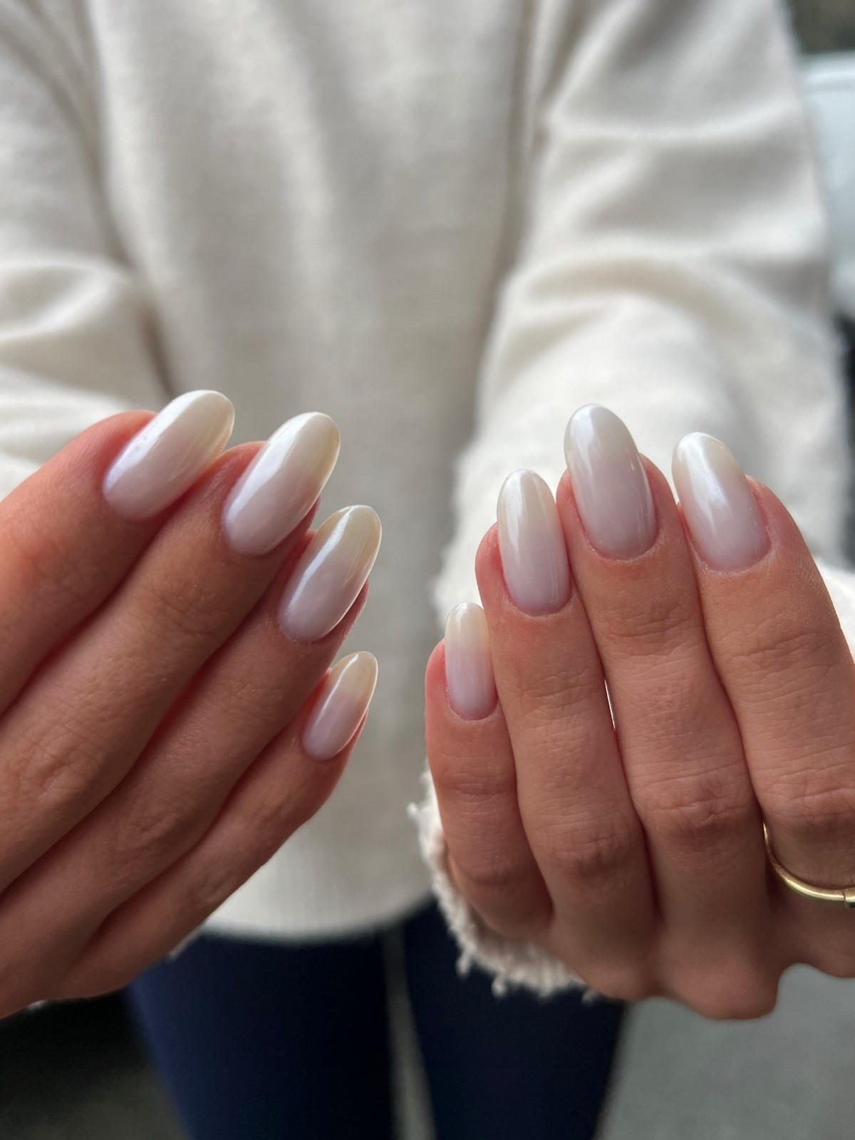Перламутровий Cloud Dancer — втілення зимового світла. Легке сяйво, що нагадує відблиск інею або перлів, робить манікюр візуально об’ємним і «живим». У 2026 році особливо актуальні холодні перламутрові переливи без жовтого підтону.
