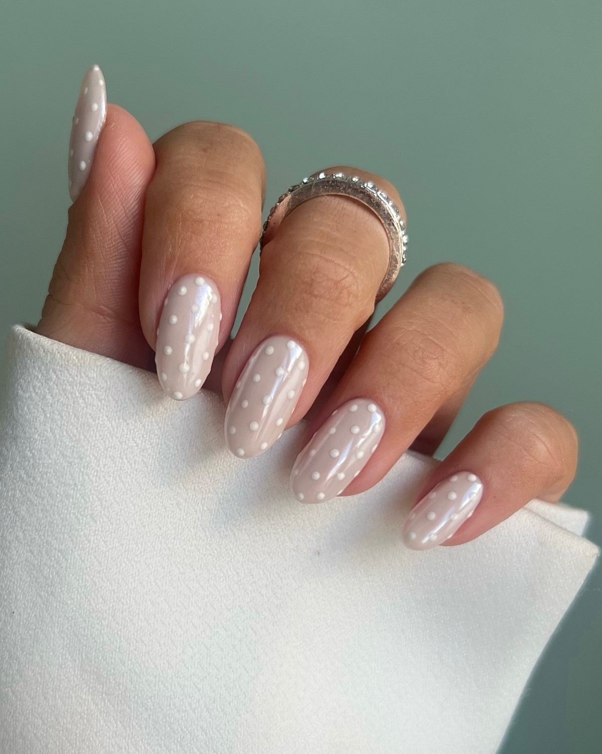 Горошок повертається в моду, але в 2026 році він стає більш делікатним. На тлі Cloud Dancer мікрогорошок в сріблястому, молочному або прозорому виконанні виглядає стильно і графічно. Такий дизайн додає образу легку ретро-ноту, не обтяжуючи його.